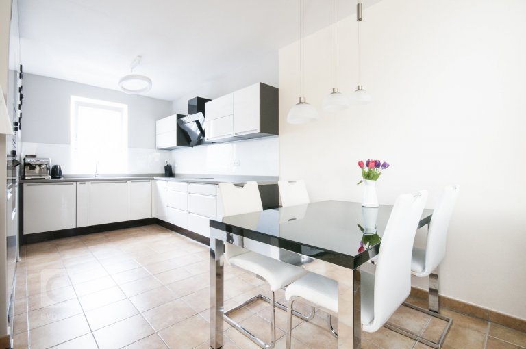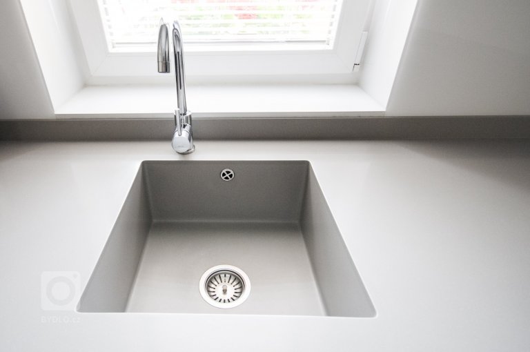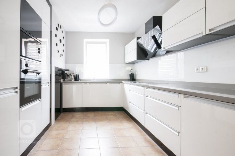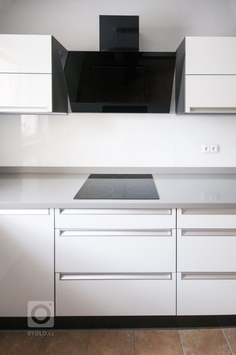 Elegantní a jednoduchá kuchyň sází na výrazný kontrast bílých a černých ploch. Lesklá dvířka a obklad kladou vyšší nároky na údržbu, ty jsou však bohatě vykoupeny nenahraditelným puncem luxusu. Šedivá pracovní deska z umělého kamene s integrovaným dřezem, stejně jako zapuštěné úchytové profily, dále podtrhují celkový čistý vysoce elegantní dojem této nadčasové kuchyně.