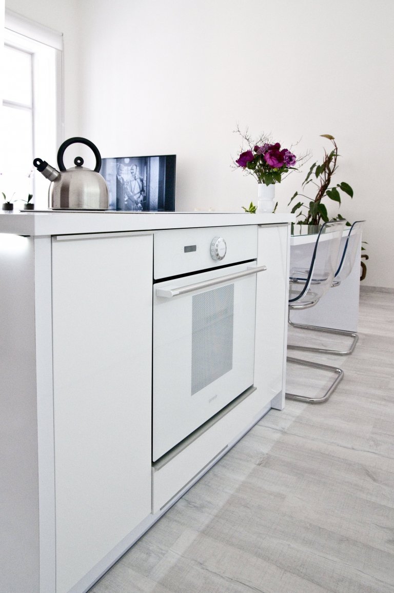 Krásná kuchyňská linka, která je laděna převážně do bílé barvy. Kuchyně působí velmi čistým, jemným a klidným dojmem. Lesklost materiálů, použití skla a světlé tóny dělají kuchyni opravdu velmi elegantní a šik. Tuto kuchyňskou sestavu bychom doporučili převážně mladým a bezdětným párům.