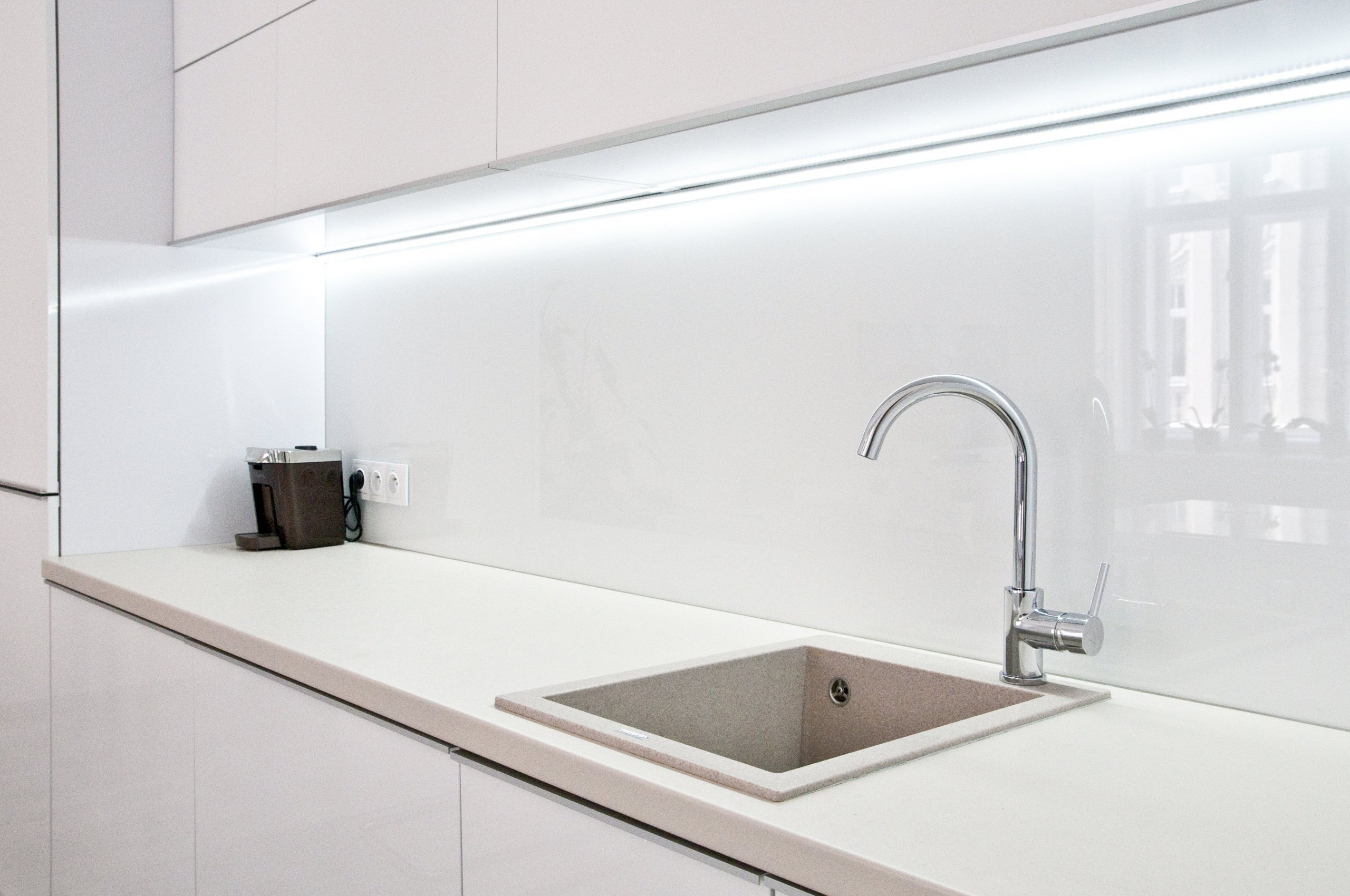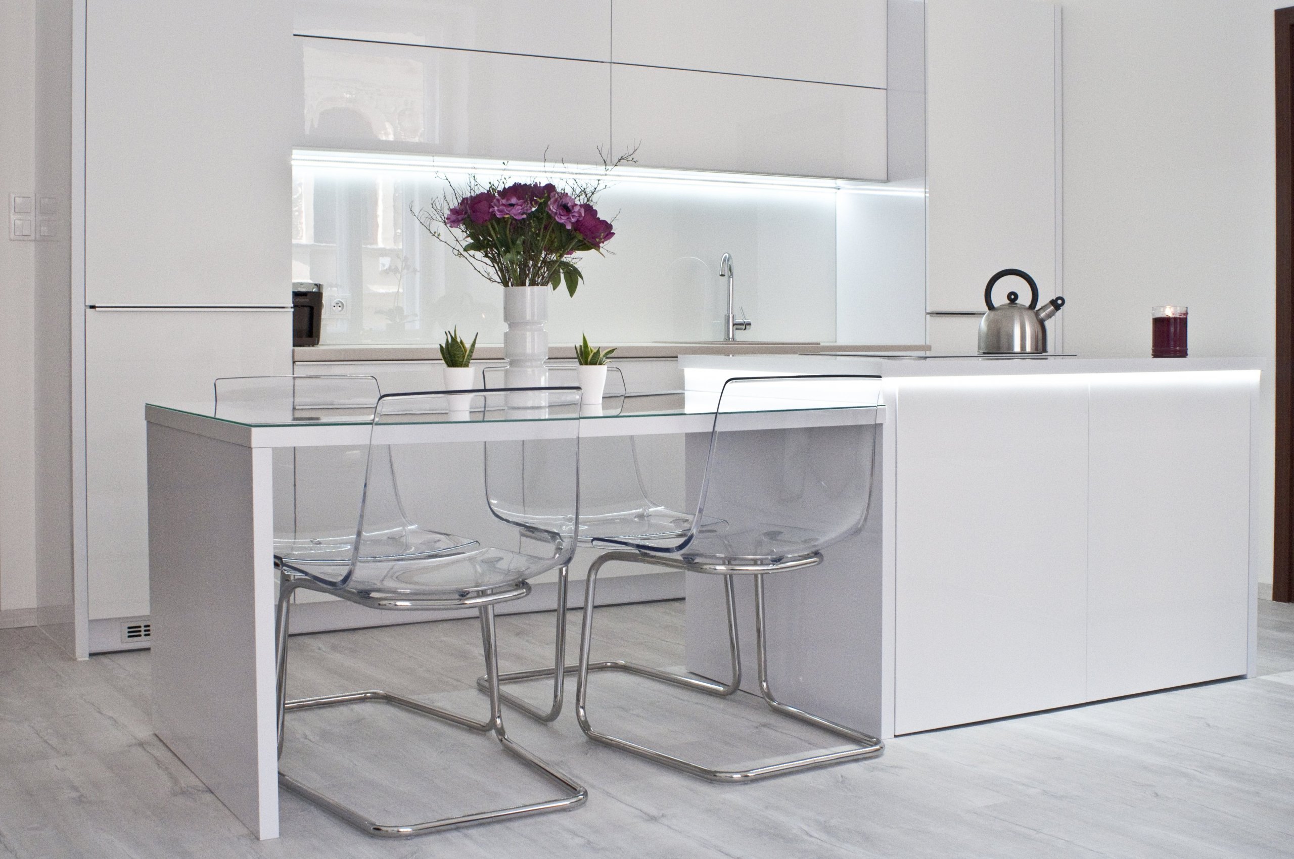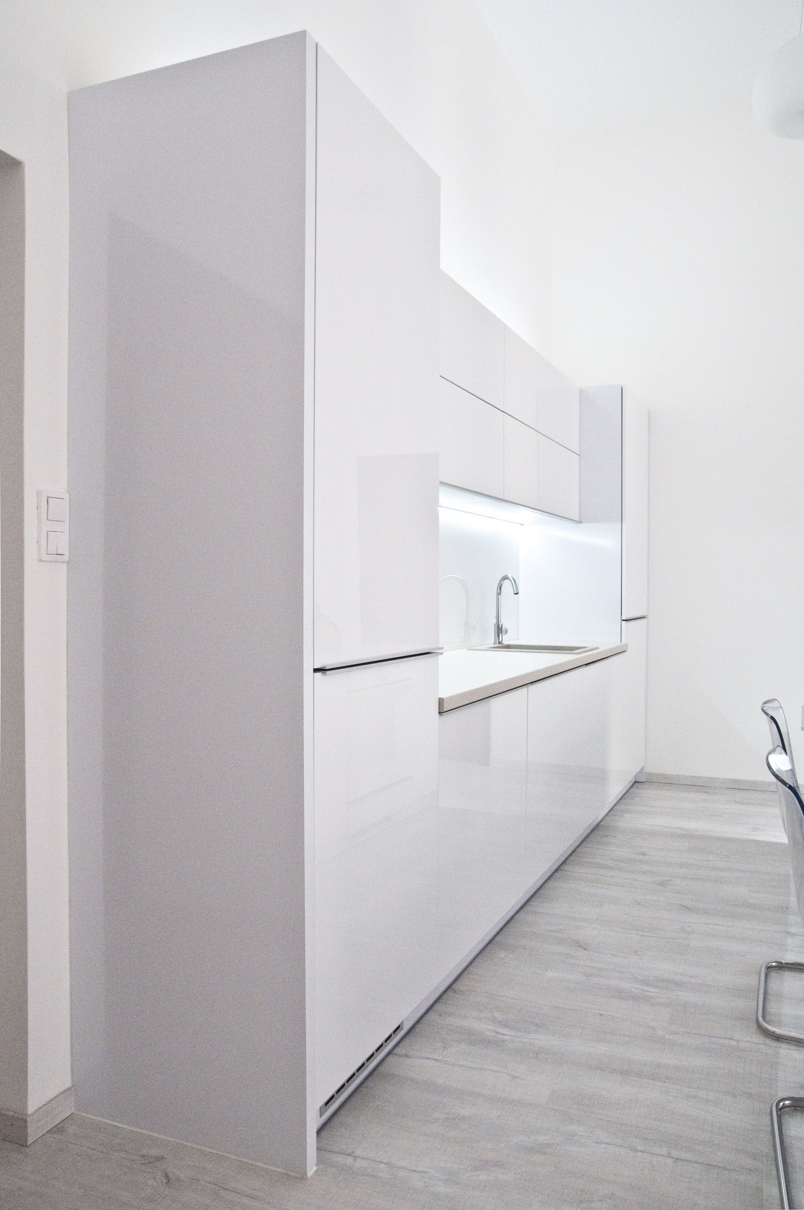 Krásná kuchyňská linka, která je laděna převážně do bílé barvy. Kuchyně působí velmi čistým, jemným a klidným dojmem. Lesklost materiálů, použití skla a světlé tóny dělají kuchyni opravdu velmi elegantní a šik. Tuto kuchyňskou sestavu bychom doporučili převážně mladým a bezdětným párům.