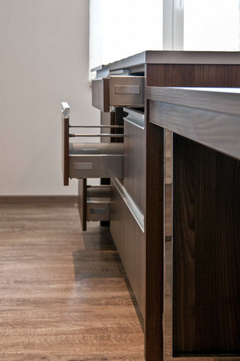 Velice moderní kuchyňská sestava působící luxusním dojmem. Majitelé vsadili na bílou lesklou barvu a velmi oblíbený dekor ořechu Ribera. Krásu kuchyně pak podtrhují kovové prvky, pracovní deska v dekoru titanu a v neposlední řadě i luxusní spotřebiče De Dietrich. Kuchyně je vhodná pro mladý pár i rodinu s dětmi.
