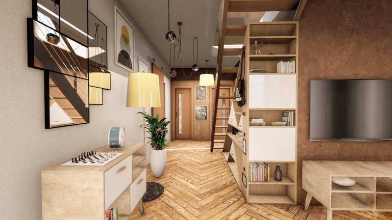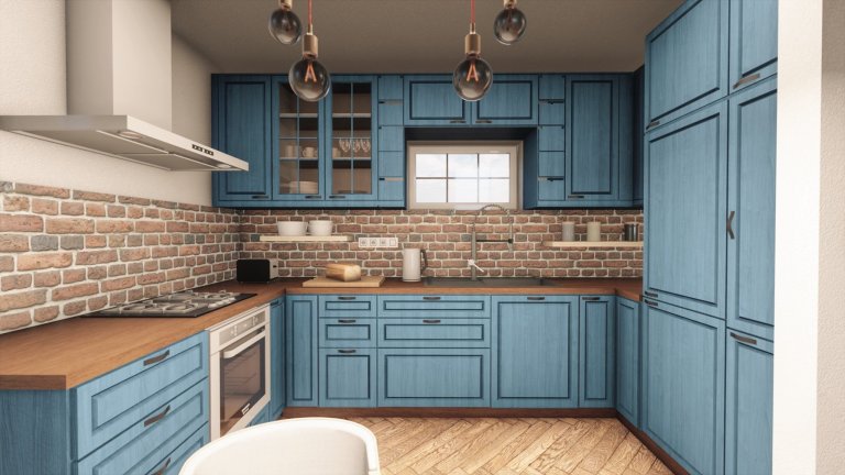 Pro klienta do novostavby jsme vytvořili vizualizaci s netradiční modrou kuchyní. Pokoj působí velmi harmonicky a útulně. Na stěnách můžeme najít keramickou dlažbu s dřevěným dekorem i moderní betonovou stěrku. Obývacímu pokoji dodává pocit pohody přírodní stůl z masivu. Doufáme, že se zákazníkovi bude krásně žít v jeho novém bydlení.