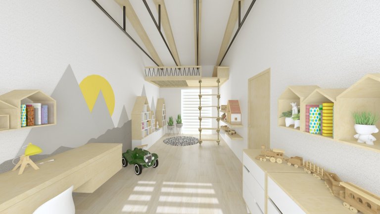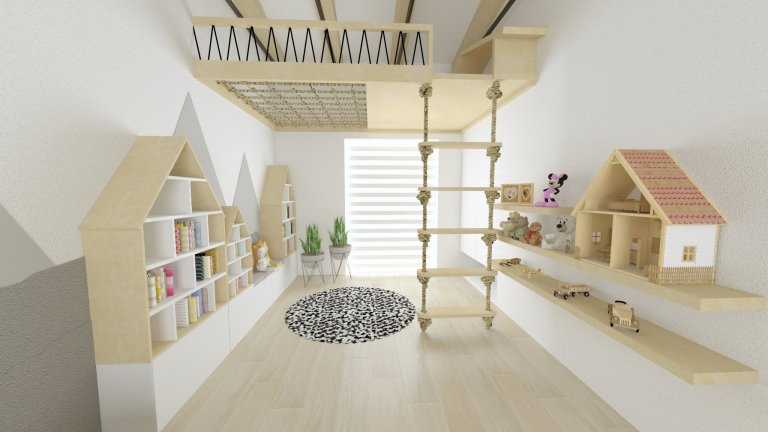 Můžeme zde najít patrovou prolézačku se sítí, psací stoly a úložné poličky na hračky.