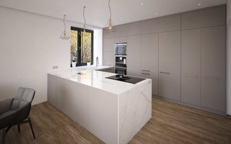 Do zrekonstruovaného rodinného domu, jsme navrhli a následně realizovali kuchyňskou linku, kde je hlavní dominantou velký ostrůvek s varnou deskou, která v sobě ukrývá i digestoř. Dalším důležitým prvkem je i plně vestavěná stěna, která v sobě ukrývá lednici, potravinou skříň, schoz na prádlo a spoustu úložného prostoru
