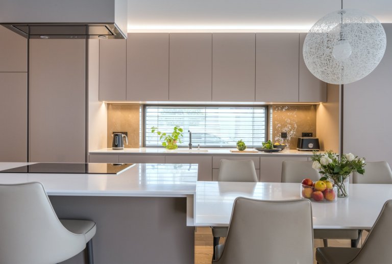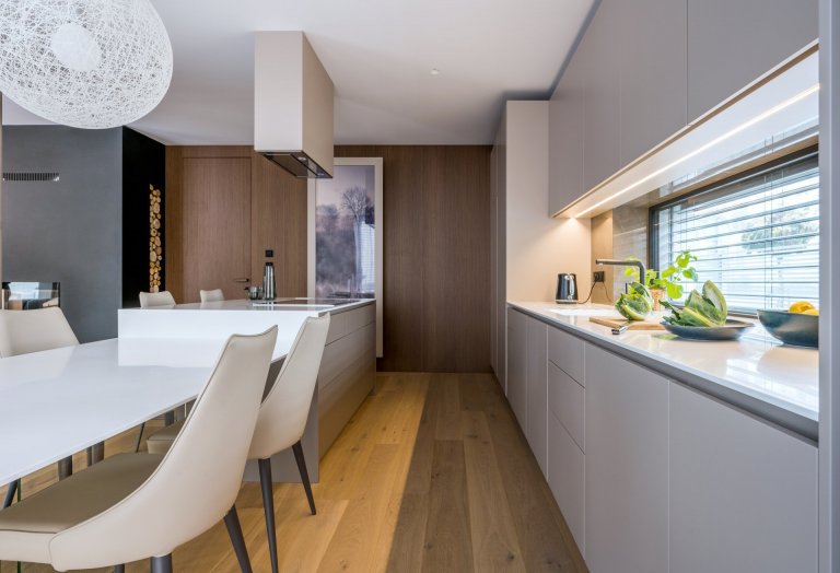 Stěžejním materiálem této realizace se stala MDF v sytějším béžovém odstínu v kontrastu s dubovou dýhou s rovnoletou strukturou. Tyto dva materiály doplnil o betonovou stěrku, krion, ale také sklo či kov, vše v menších plochách. „Klienti neměli žádné záludné požadavky či nestandardní nároky. Jediné zásadní přání měla paní domu, přála si místnost, kde bude mnoho úložného prostoru a velkorysé sezení i dostatek denního světla, aby měli jakousi kreativní dílnu, kde za sebou pouze zavřou a dům je uklizený.