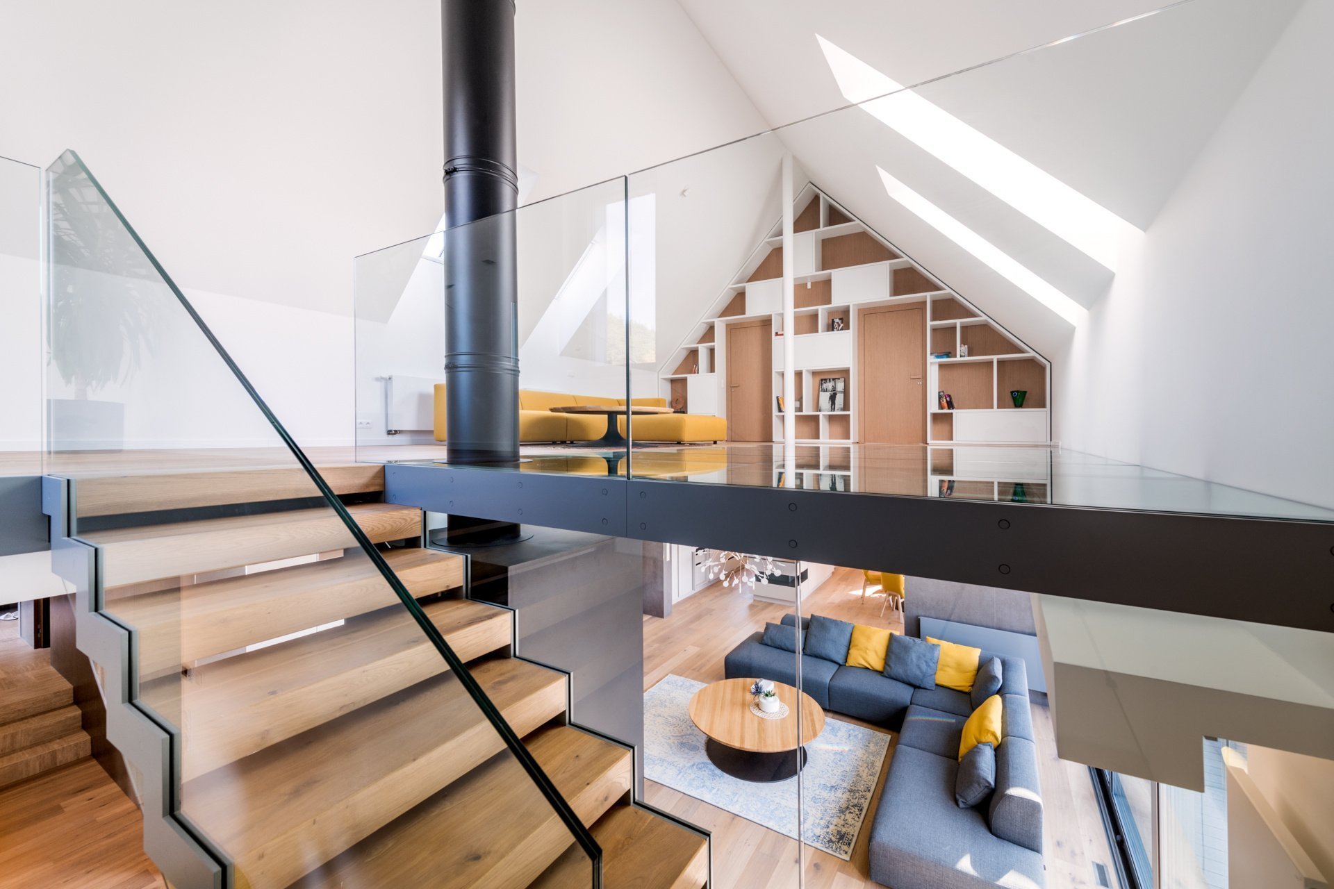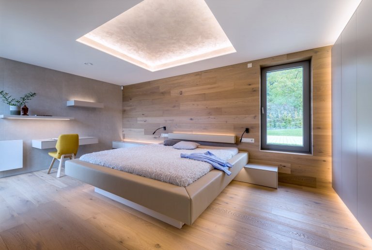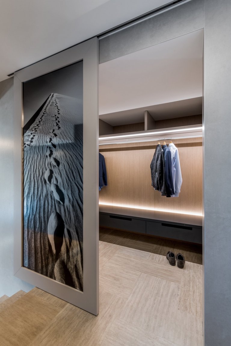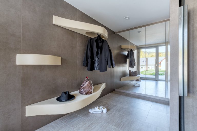 Hlavním výtvarným motivem pro ztvárnění interiéru bylo respekt k okolní přírodě a používání přírodních materiálů i v interiéru. Proto jsem zvolil jako nosné motivy dubové dřevo (podlaha, nábytek), lakované povrchy v odstínu bílé a béžové a obklad velkoformátovou keramikou v zemitém šedém dekoru. Maximum úložných prostor je skrytých )za zrcadly, posuvnými dveřmi, které vypadají jako obraz či ve skříních, které tvoří obklad stěn v líci s dveřmi. Citlivým prvkem je rovněž práce s nepřímým osvětlením, které dává velkorysým prostorům několik možných scén, kterými je možné dotvářet atmosféru dle aktuální denní doby a množství přirozeného světla v interiéru. Inovativní jsou jistě bezfalcové dveře v rovině obkladu opatřené velkoformátovou keramikou, které se propisují jen obvodovou sparou a klikou. Tento detail dal vzniknout celistvým plochám, kterými jsou pojednány stěny v centrální chodbě a který výborně spolupůsobí s travertinovou dlažbou kladenou na římský způsob. Interiér je doplňen originálními abstraktními malbami umělkyně Viktorie Zacharové.