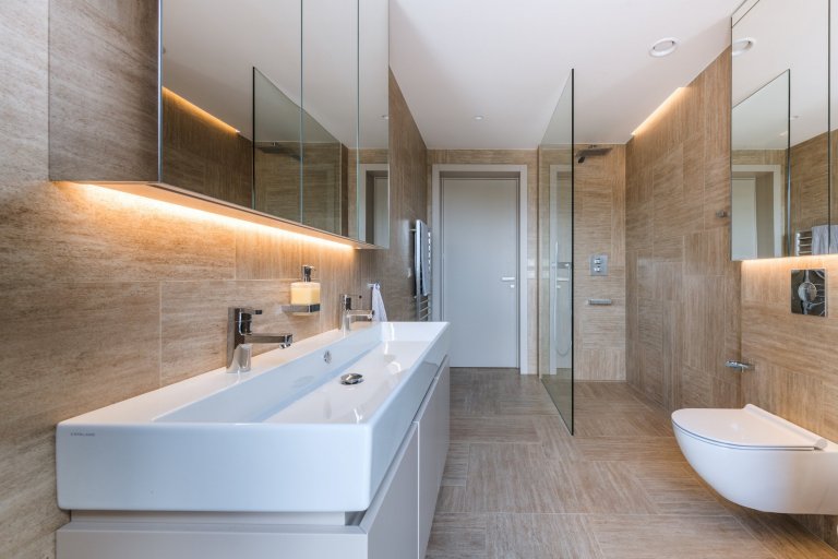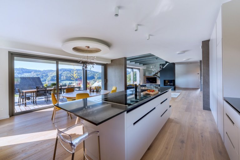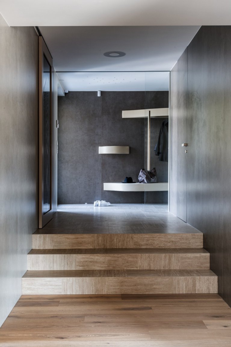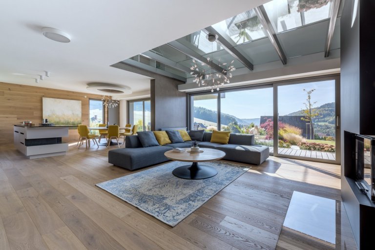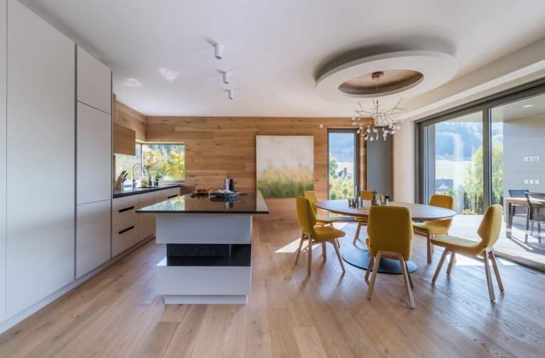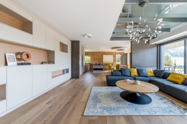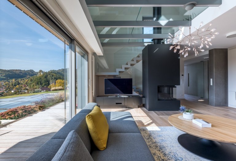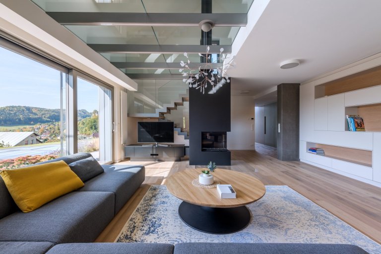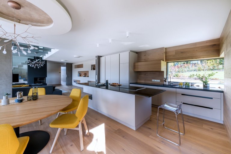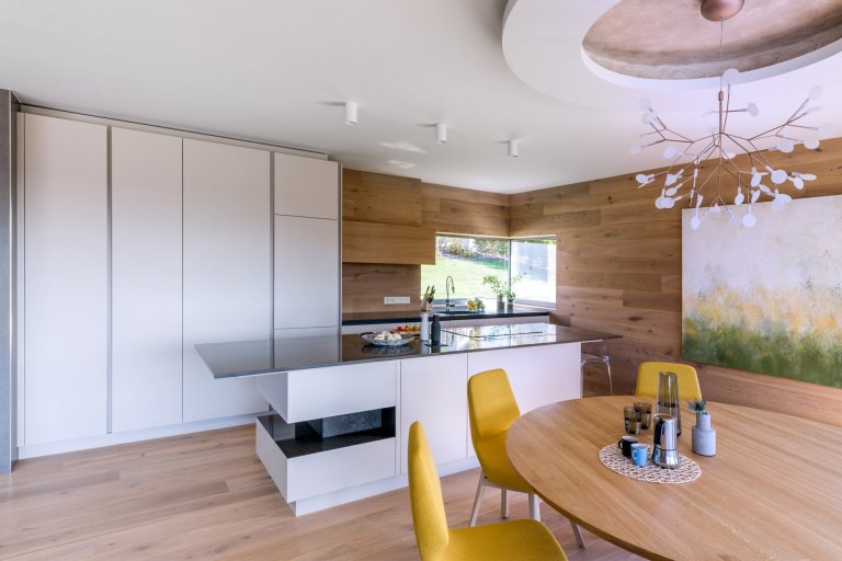 Hlavním motivem pro ztvárnění interiéru byl respekt k okolní přírodě a používání přírodních materiálů. Proto architekt zvolil jako nosné motivy dubové dřevo, lakované povrchy v odstímu bílé a béžové a obklad velkoformátovou keramikou v zemitém šedém dekoru. Citlivým prvkem je rovněž práce s nepřímým osvětlením, které dává velkoryse pojatému prostoru několik možných scén.