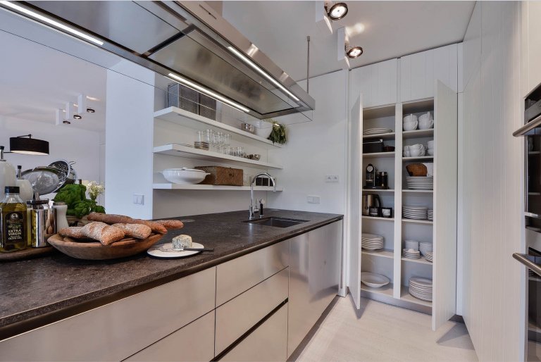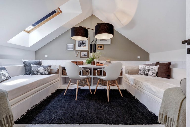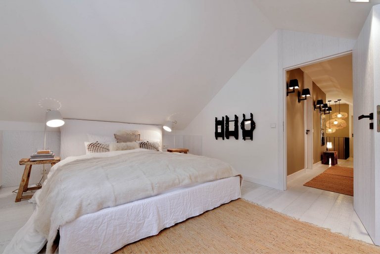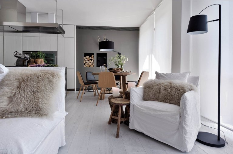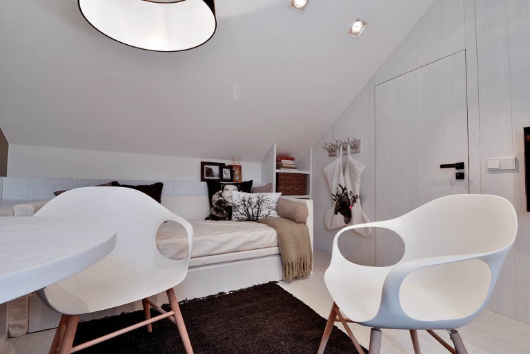 Bylo třeba se vyrovnat se všemi specifiky rezidenčního bytu, a zároveň do podkroví dostat příjemnou, velmi přírodní a domácí atmosféru. Dřevěné stěny i nábytek, houně, lněné pohovky, kožešinové polštáře, kámen, prostě „regulérní horský srub“. A zároveň moderna dvacátého století v nových tvarech, nerezu a černé barvě – symbióza a protiklad v jednom.