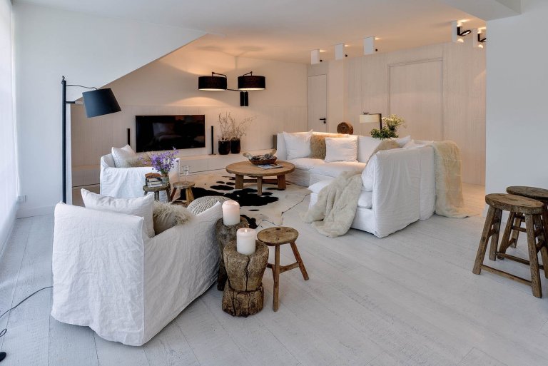 Vyvážený mix rustikálního a moderního stylu. Jednoduchá barevnost interiéru v bílošedých tónech s použitím surového, přírodního dřeva v doplňcích a solitérních kusech nábytku vytváří ležérně útulnou dovolenkovou atmosféru.