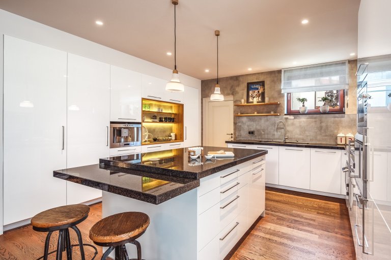 Pracovat na návrhu a realizaci tohoto prostoru mě velice těšilo. Vybraná kombinace betonové stěrky, bílé lakované MDF, černé kamenné pracovní desky a dřeva byla jednoznačnou volbou pro tuto moderně pojatou kuchyni. V jídelně jsme se nakonec rozhodli ponechat původní dřevěný stůl a doplnili jej židlemi od zn.Snel a designovým závěsným osvětlením. Díky této citlivé kombinaci moderních prvků a nábytku v industriálním a vintage stylu, pak tento prostor působí velmi útulně a přívětivě.