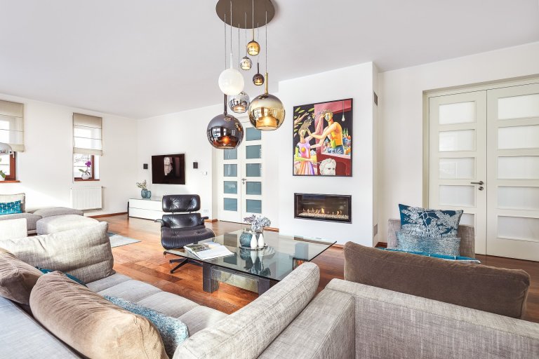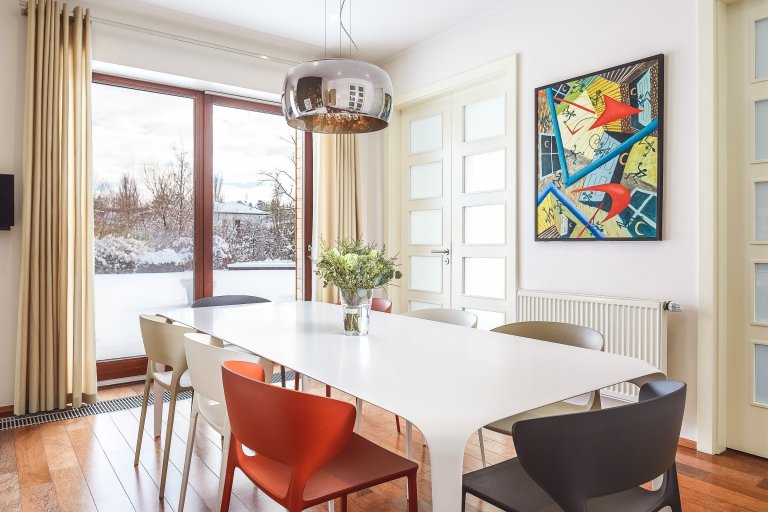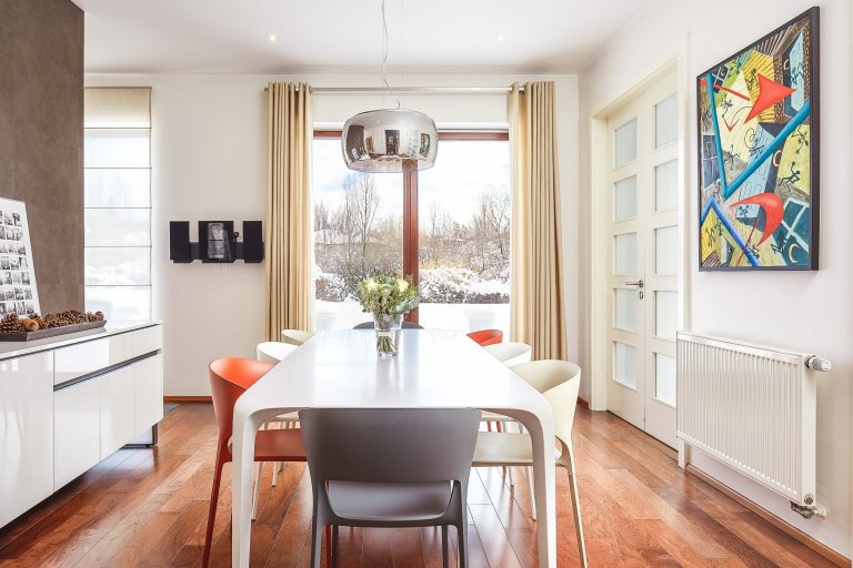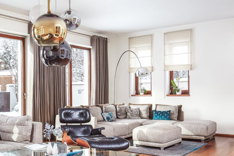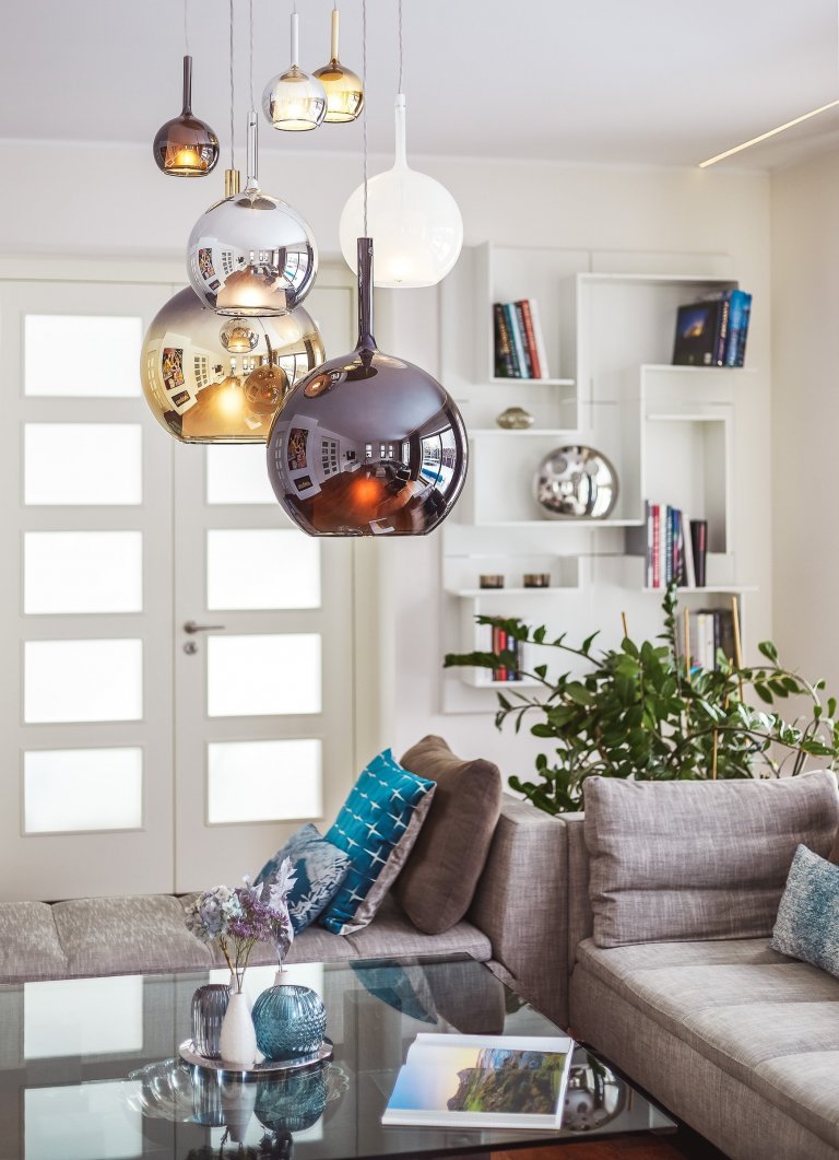 Věděli jste, že je dekorativní osvětlení “šperkem“ domu? Je to naprostá pravda, a to i v případě tohoto projektu. Skvostné skleněné koule od Penta lights a nestárnoucí stojací lampa Arco jsou třešničkou na dortu v tomto obývacím pokoji. Kromě dekorativního osvětlení jsme změnili osvětlovací schéma pro celý dům a vybrali skoro neviditelná, a přesto funkční vestavěná světla. Byl vybrán nový nábytek do jídelny a také došlo k úpravě barevného schématu. K neutrálnímu základu jsme zvolili akcentní barvy v podobě terakotové v jídelně a sytě modré v obývacím pokoji. V neposlední řadě došlo i na nové textílie vč. okenních dekorací, koberců a dekorativních polštářků.