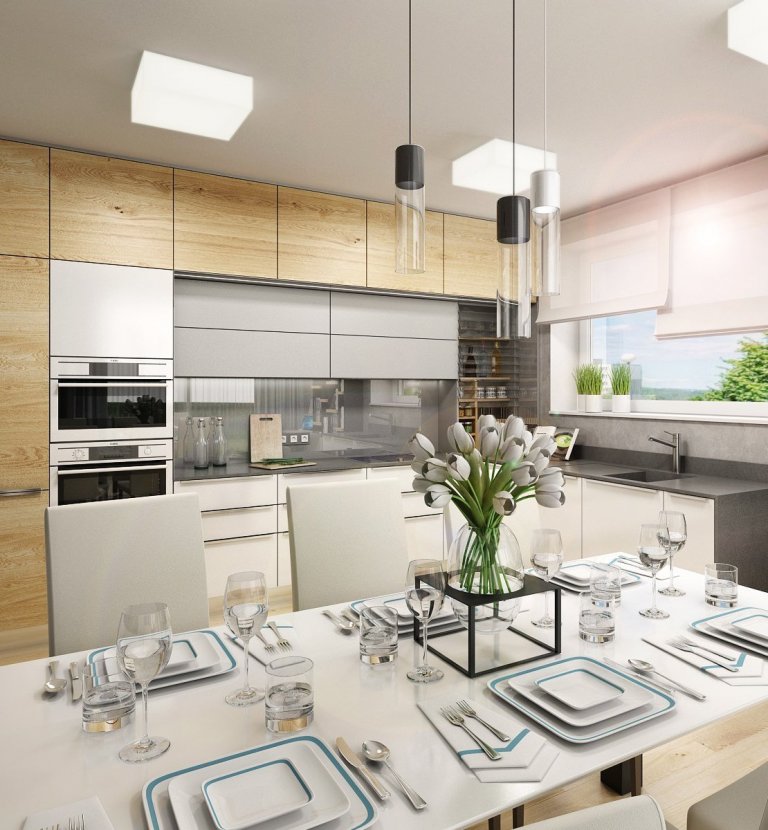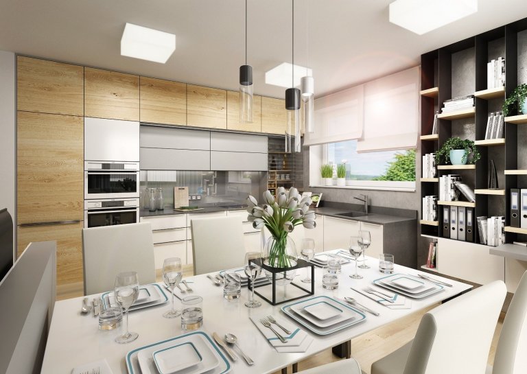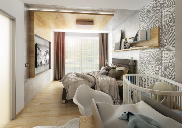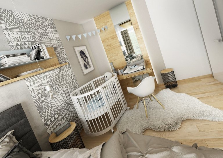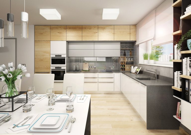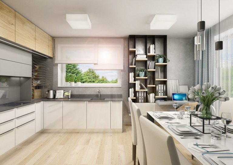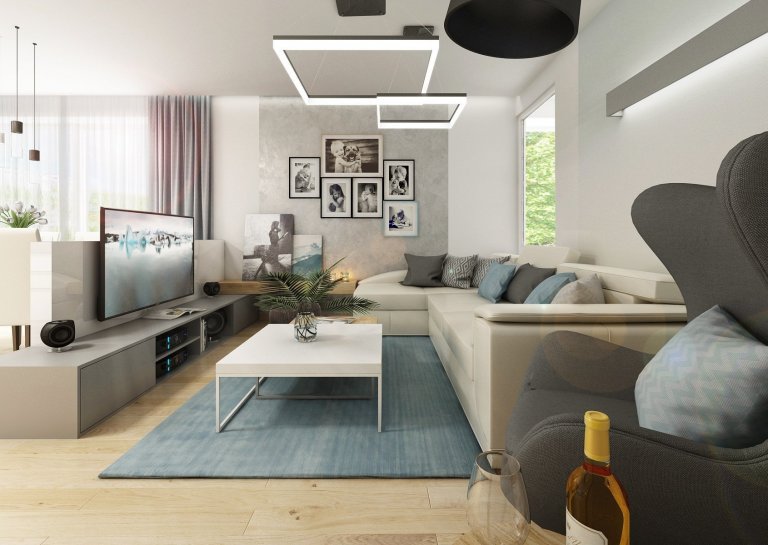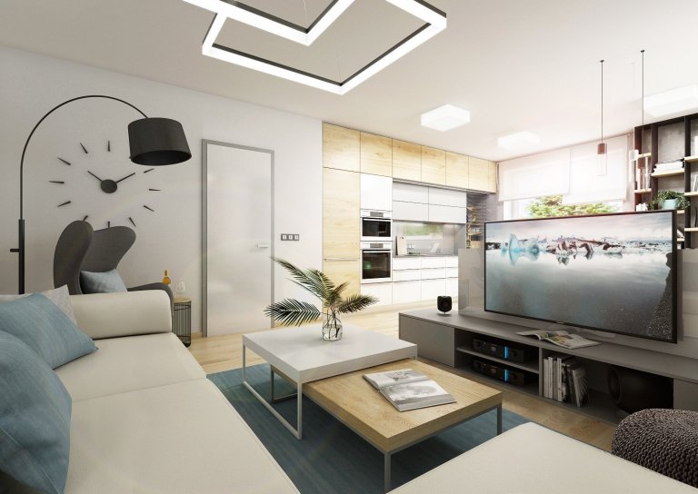Návrh třípokojového bytu s kuchyní je ve světlých odstínech šedé a přírodního dubu s bílou. V kontrastu se objevuje barva antracitová např. pracovní deska v kuchyni z Technistone, čalounění postele nebo knihovna a tyrkysová barva. TV stěna je ve společném prostoru obývacího pokoje a kuchyně zároveň dělícím prvkem, který je opticky rozděluje na jednotlivé zóny.