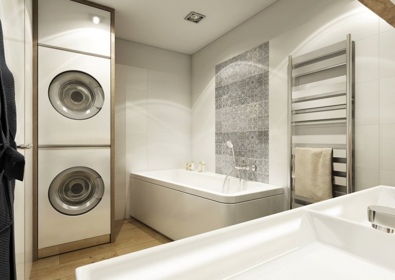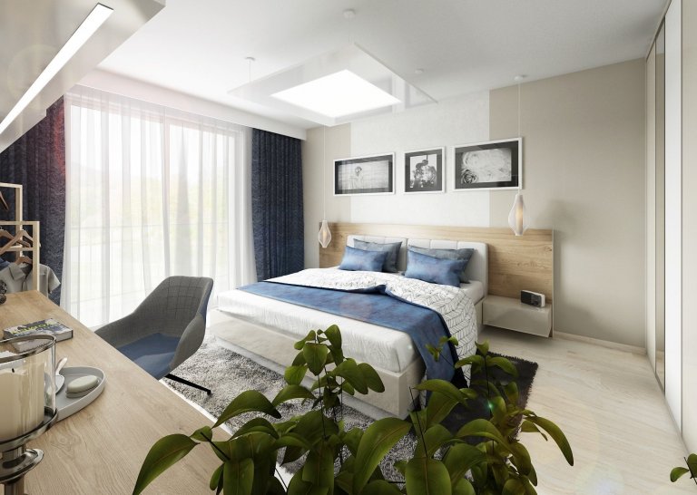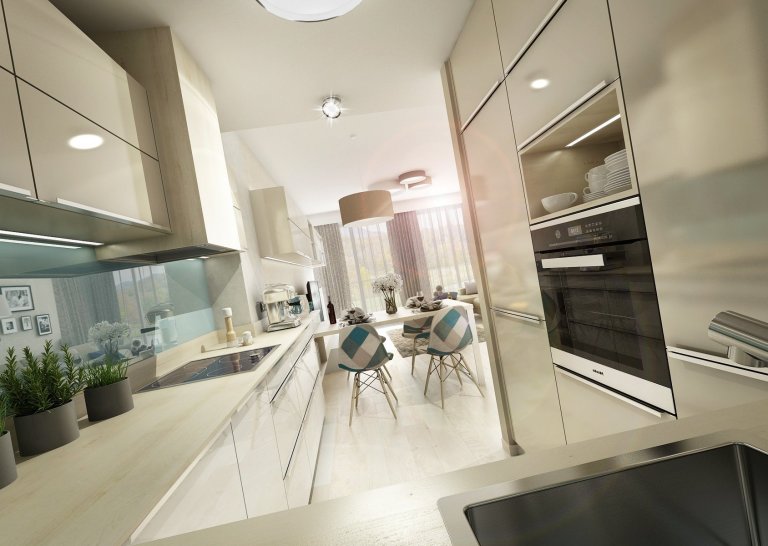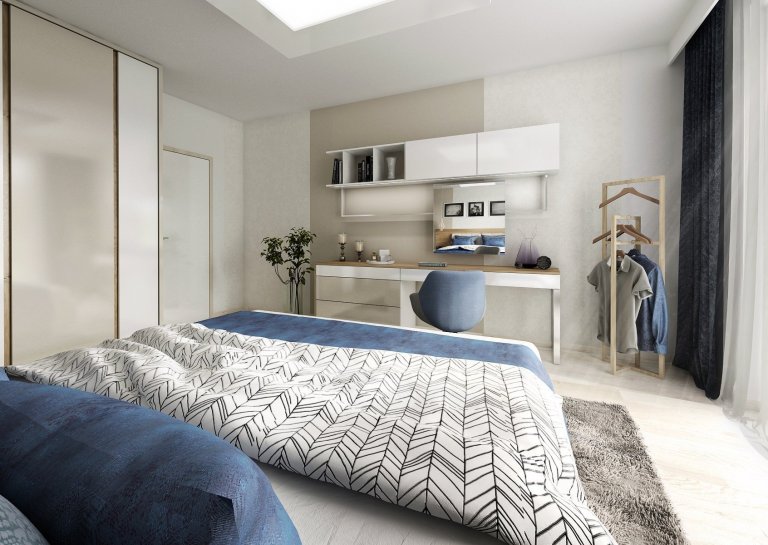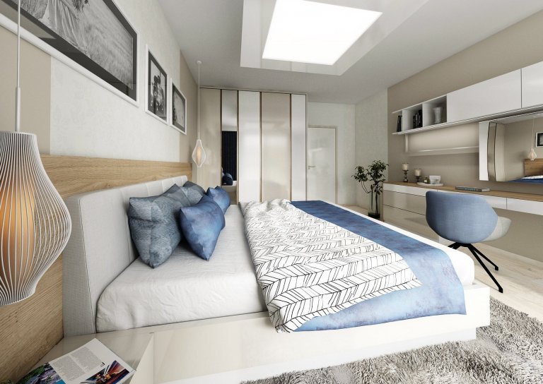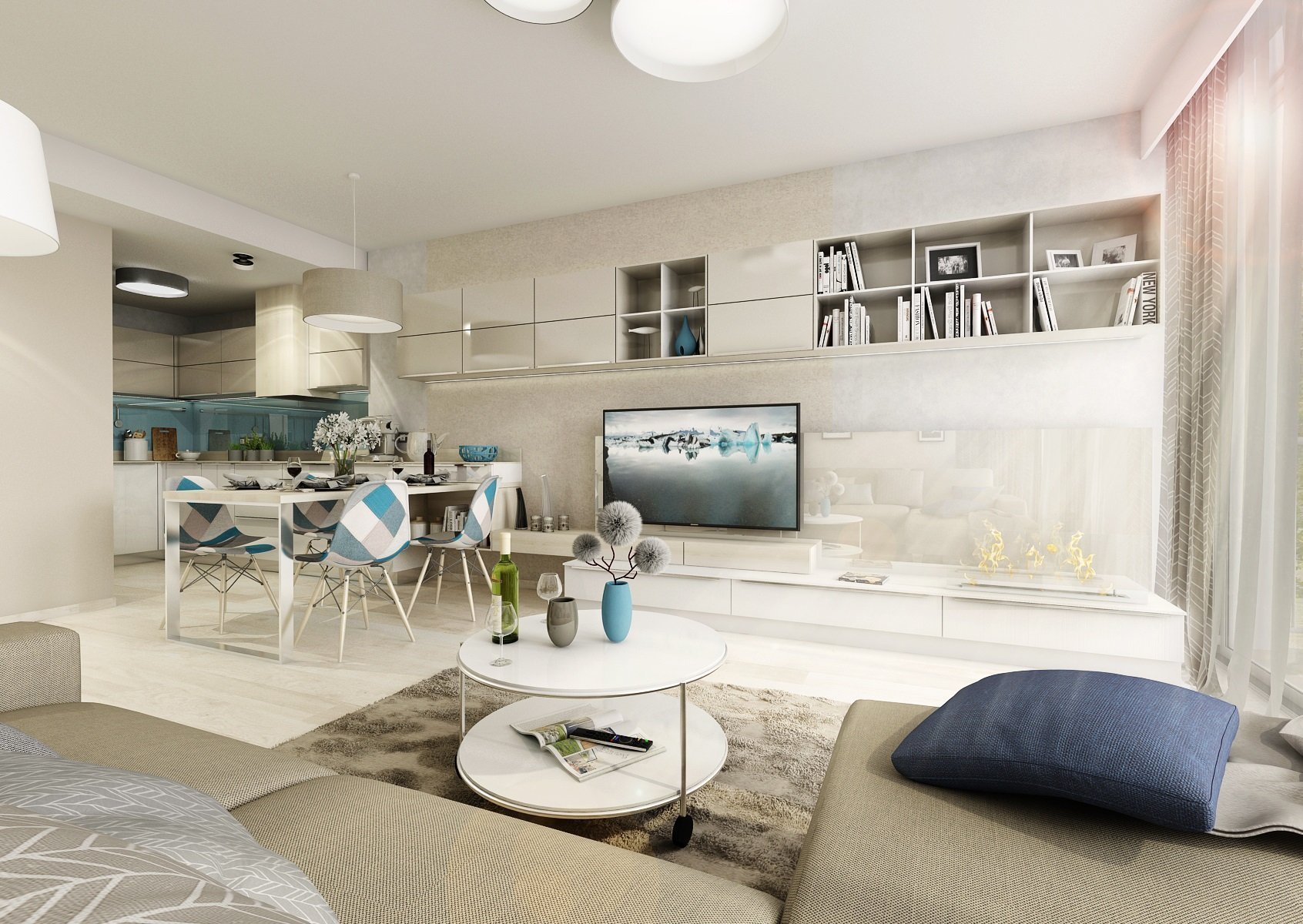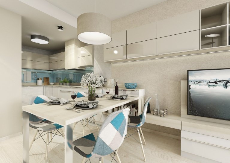 Brněnský byt je z většiny navržený v bílo-béžové kombinaci občas doplněné modrou a koňakovým dekorem dubu. V obývací části je kuchyňská linka navržena tak, že volně přechází v …