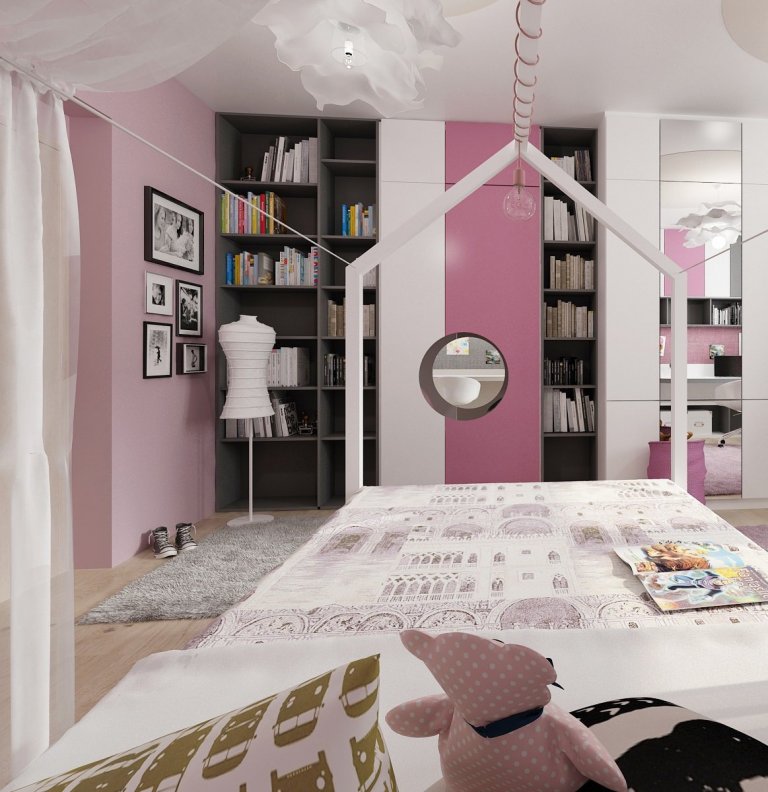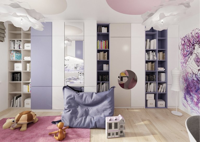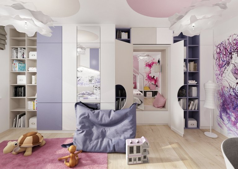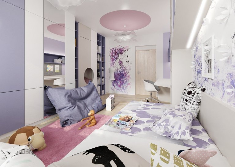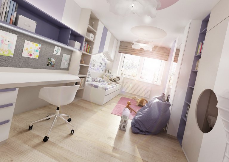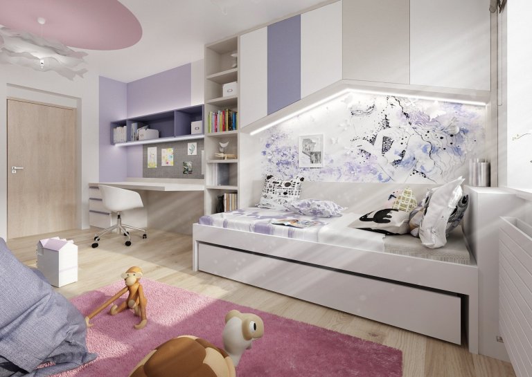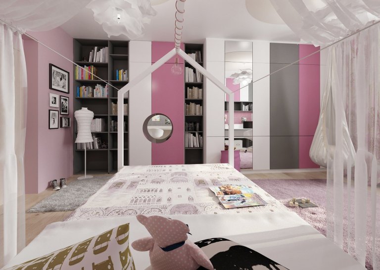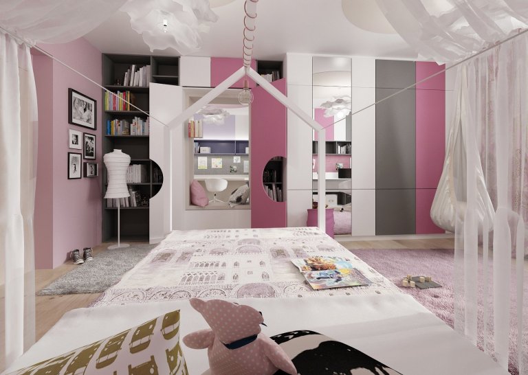 Dva pokoje pro dvě sestry vzájemně propojené průchodem skrz skříně. Pokoj starší dívky je v růžové, antracitové a bílé barvy. Nad postelí je rámová konstrukce z masivu tvaru stříšky s baldachýnem a závěsné žárovkové svítidlo E27. U mladší dívky jsme stříšku nad postelí vytvořily ze skříňové sestavy a barevnost pokojíku je v barvách lila, béžové a bílé. Obě sestry mají na stěnách tištěné tapety na míru z fotobanky stylizované dle barevnosti pokojíčků.