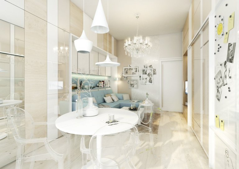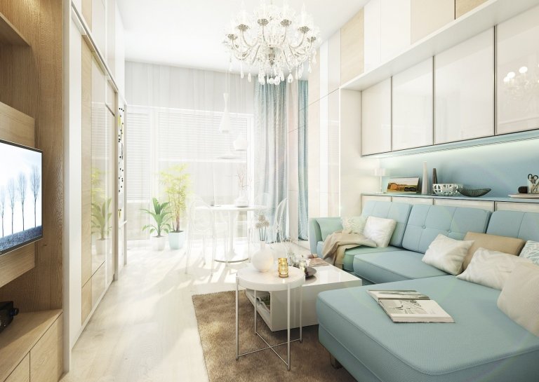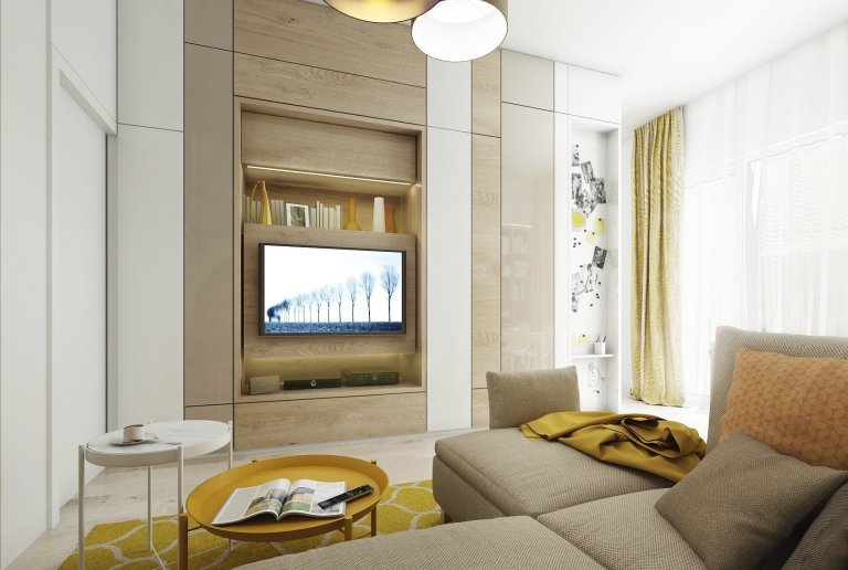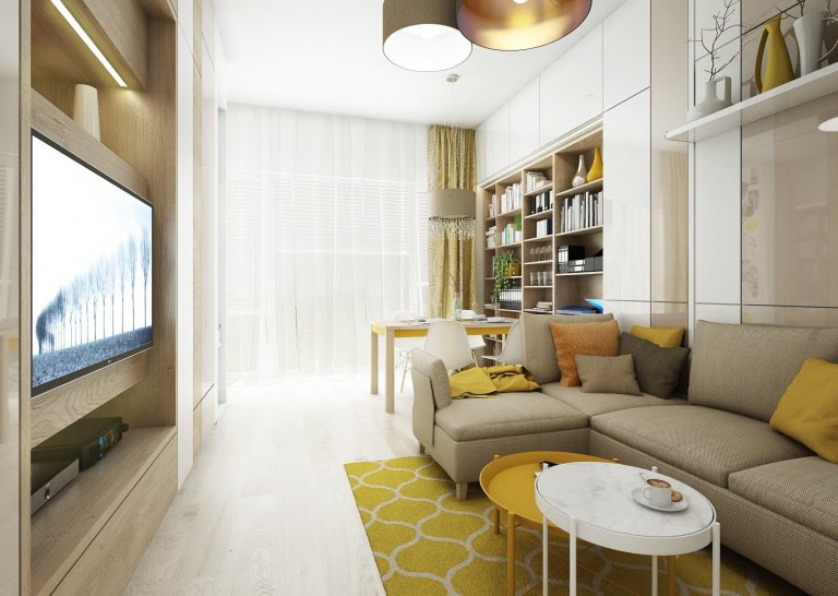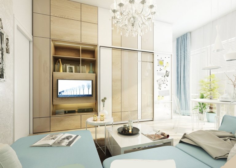 Ne vždy musí být v malé garsonce rozkládací sedací souprava, která slouží i jako lůžko či naopak. Použitím sofistikovaných výklopných systémů lze mít téměř nezávisle obojí. V našem návrhu je během dne klasicky rohová sedací souprava i s konferenčními stolky. Když nastane čas jít spát, tak přes sedací soupravu vyklopíme ze skříňové sestavy postel.