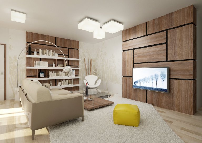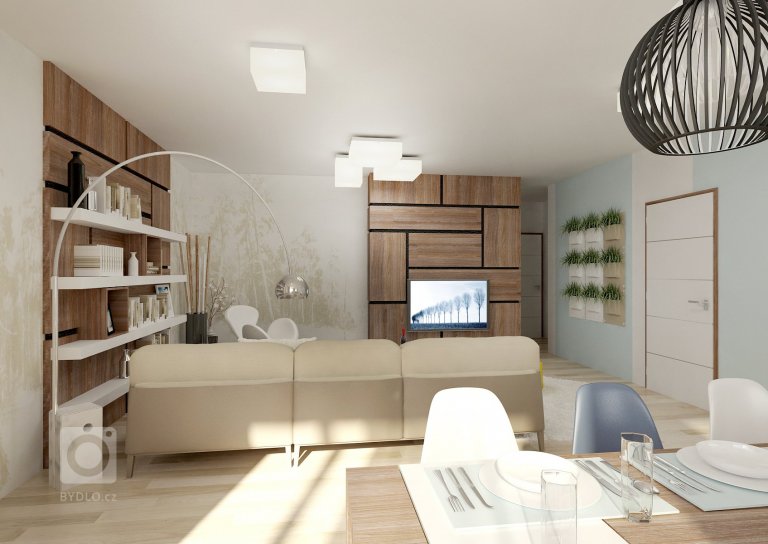 Komplet návrh bytu 2+kk . V interiéru se střídá světlý dřevodekor na vinylové podlaze s tmavším na nábytku. Dominantou obývacího pokoje jsou výrazné obkladové panely, obrazová tapeta od…