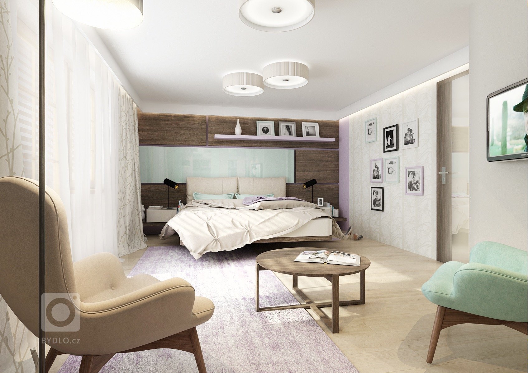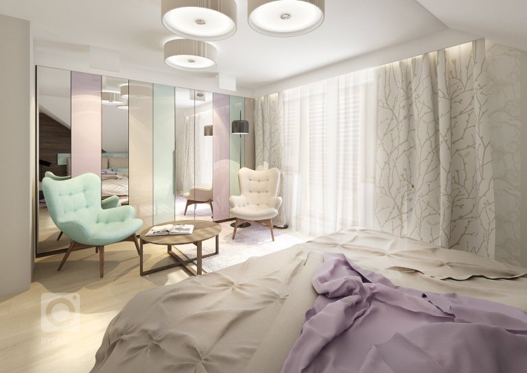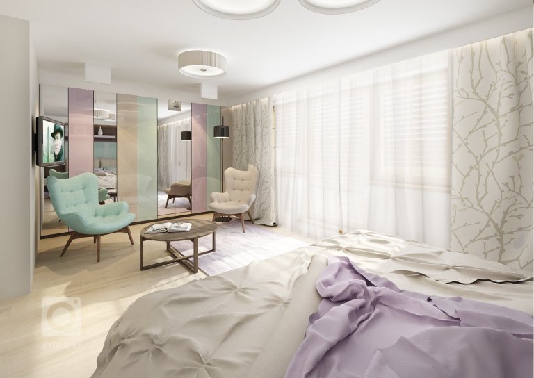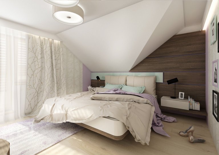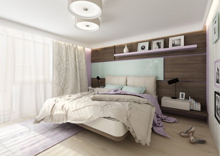 Uklidňující levandulové a mintové pastelové barvy spolu s béžovou a tmavě hnědou dřevodekoru wenge vytvářejí příjemnou atmosféru pro manželskou ložnici. Vestavná skříň má dvířka v …