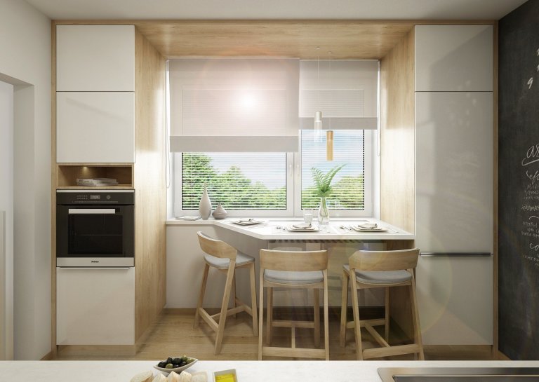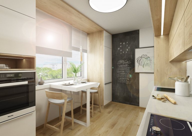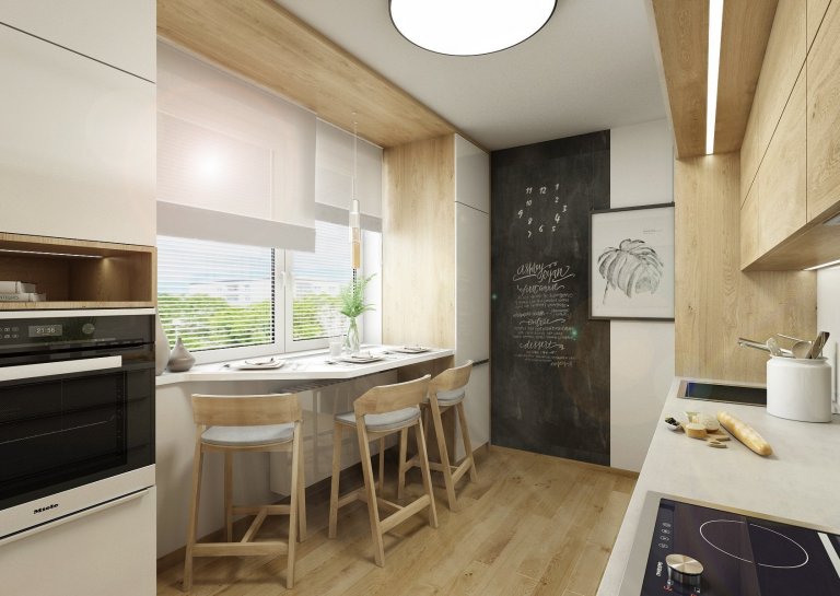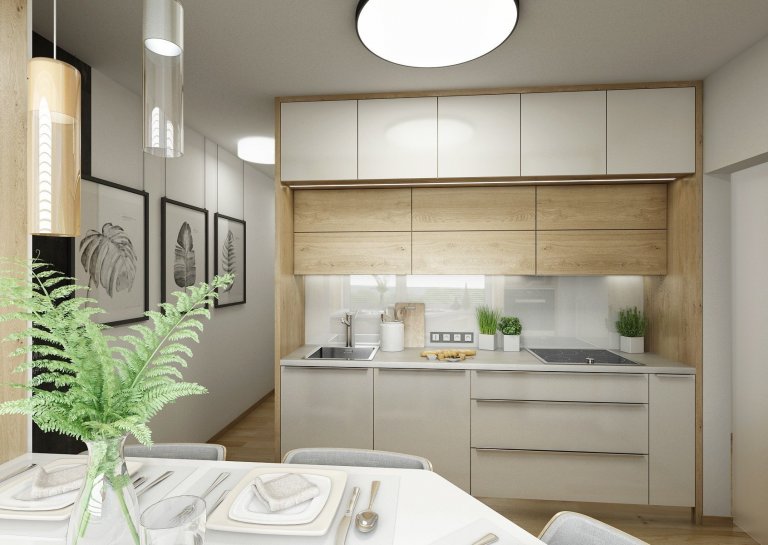 Rekonstrukce kuchyně v paneláku, návrh řešení kuchyňské linky v panelovém domě. Netradičně je místo obkladu za pracovní deskou je použita zástěna z barevného skla.