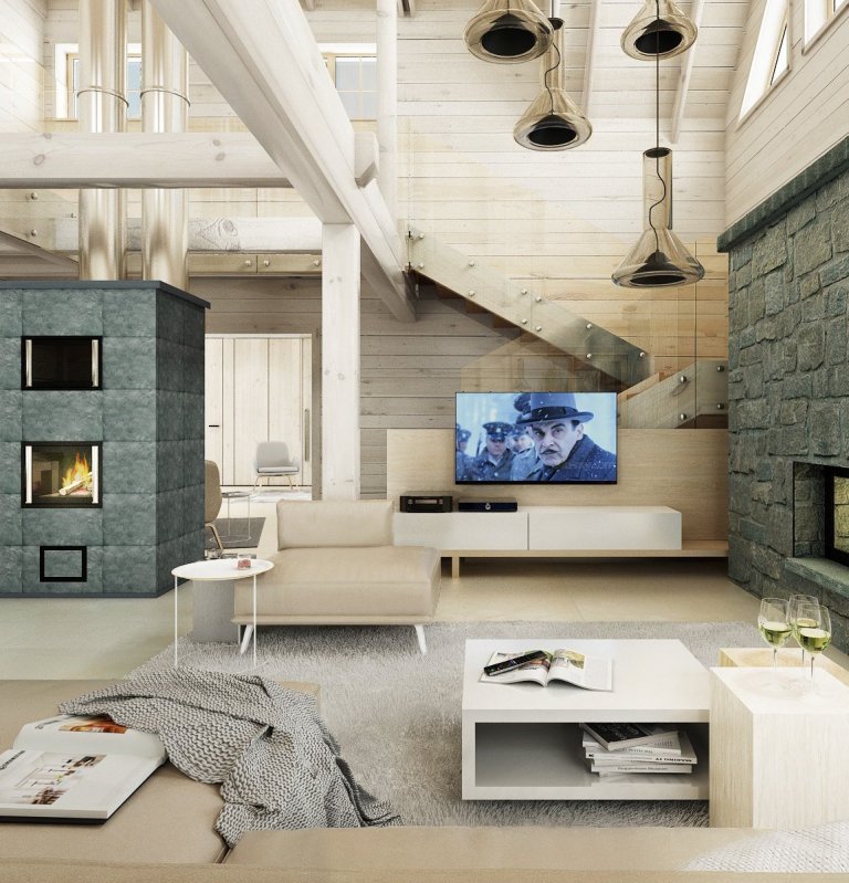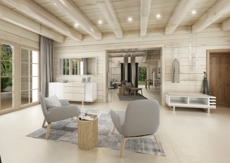 Moderní roubené stavby se stávají poslední dobou čím dál populárnější. V interiéru se to odráží především skloubením vesnického rustikálního stylu (trámy, kamenné obklady, dřevěné špalky) s moderními designovými prvky (skleněné zábradlí, svítidla Whistle či křesla Era).