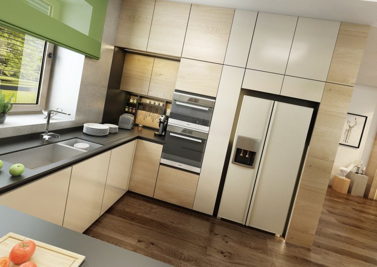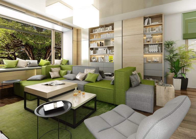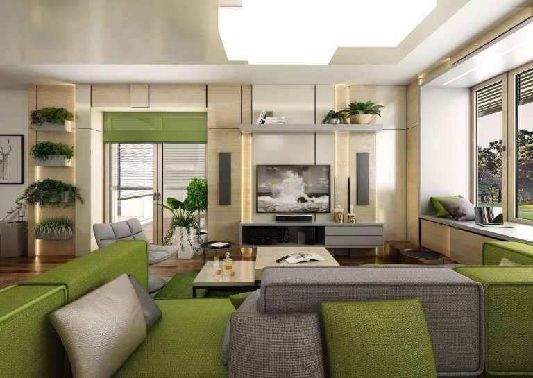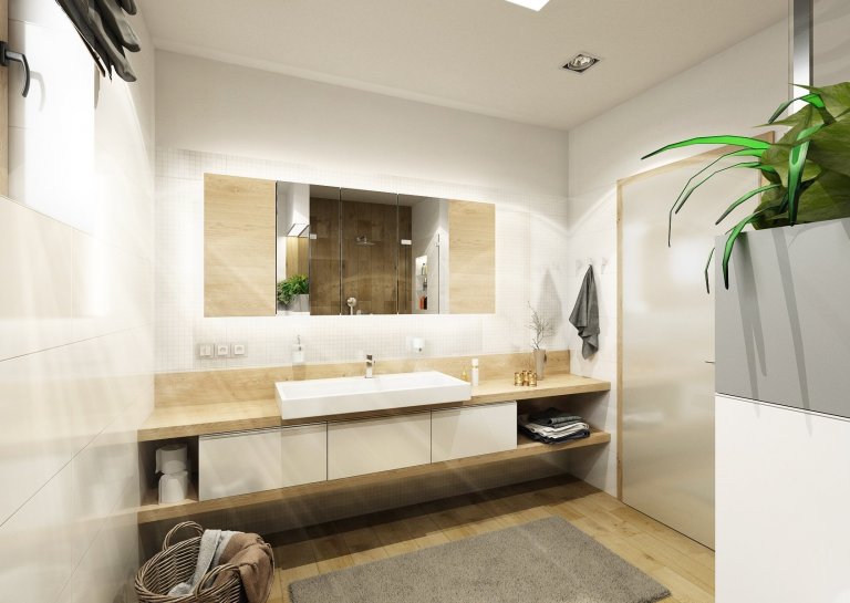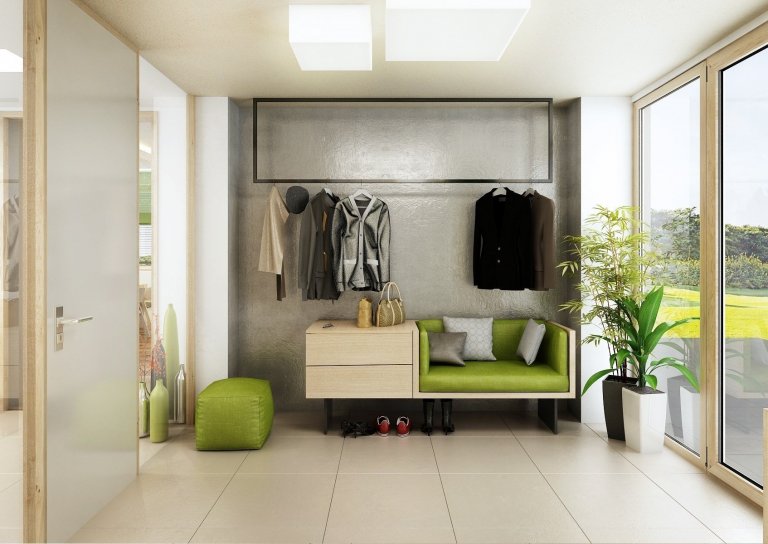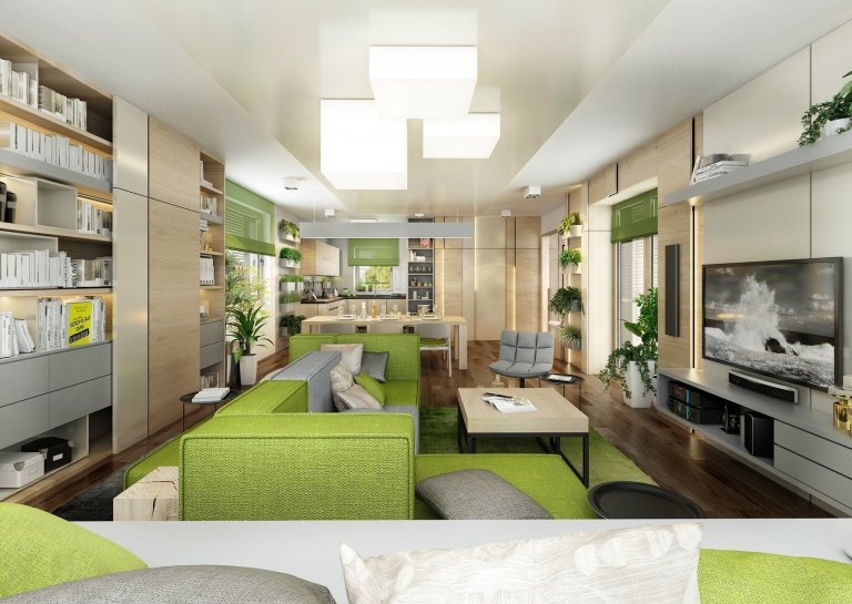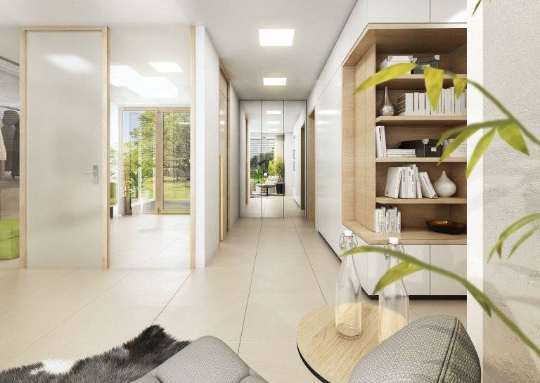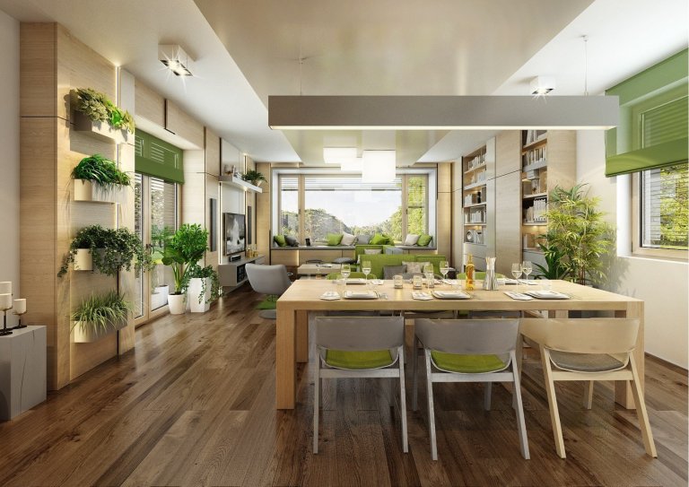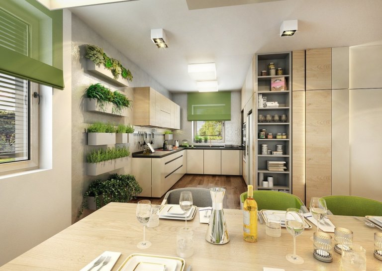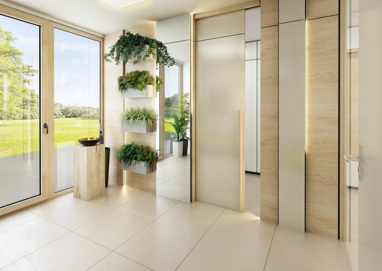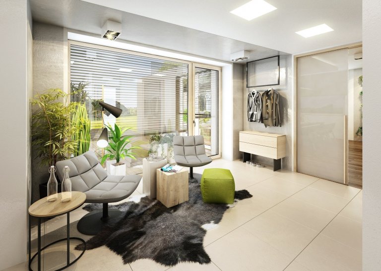 Do návrhu moderního interiéru domu na Vysočině si majitelé přáli zakomponovat dostatek zeleně. Zvolili jsme tedy neutrální kombinace bílé, champagne, přírodního dubu, šedé a jako výraznou podlahu v tabákovém dubu. Zelenou jsme do interiéru přidali formou volně stojících květin i nástěnných květináčů, tak i ostatními doplňky -židle, sedací souprava, textil.