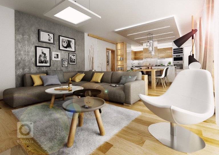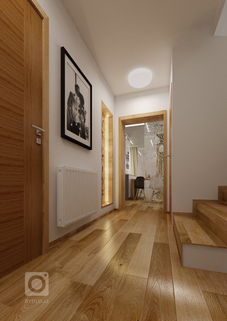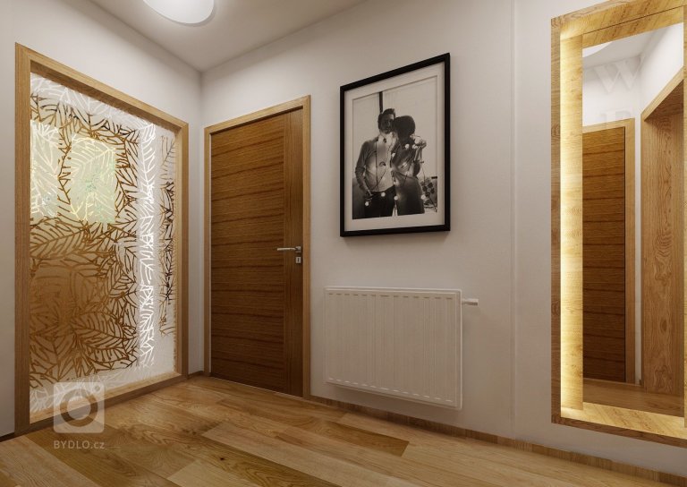 Rekonstrukce RD v Praze se nese v moderním trendu dýhy medového dubu, bílé lesklé LTD a doplňkové šedé barvy na prac. desce v kuchyni z umělého kamene a dekorační stěrce. Domem se prolíná grafický motiv listů, který se pískovaný opakuje na sklech v kuchyni chodbě.