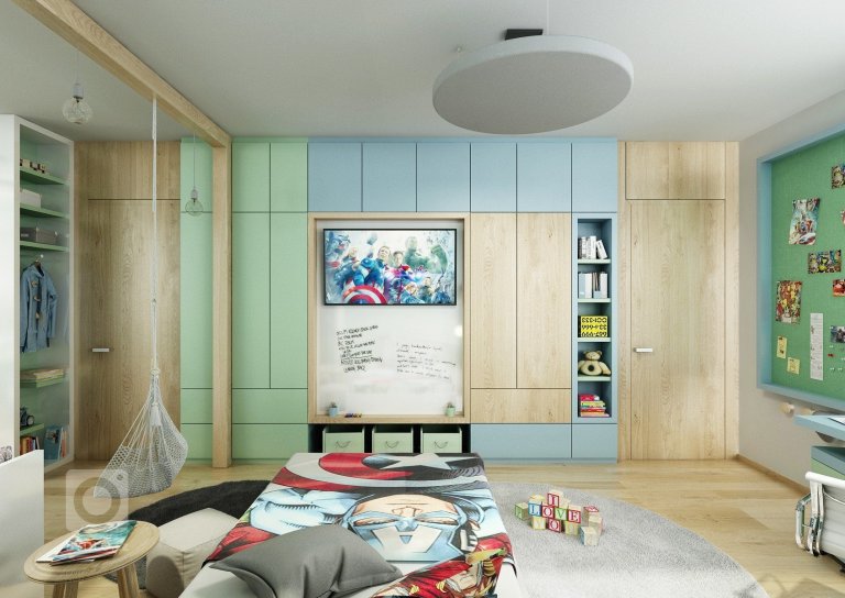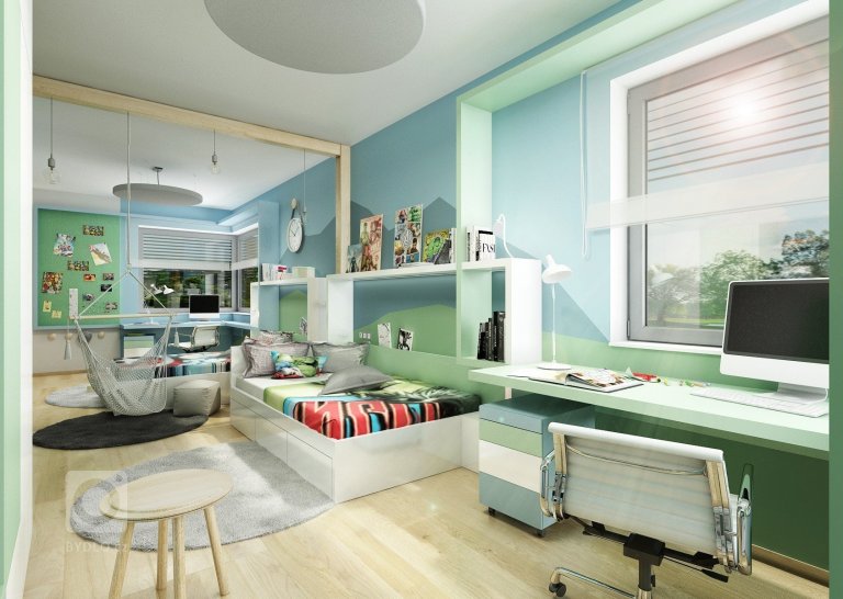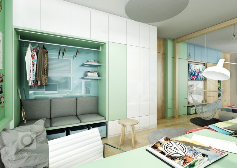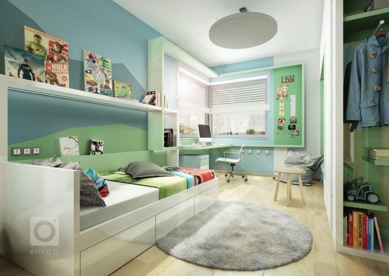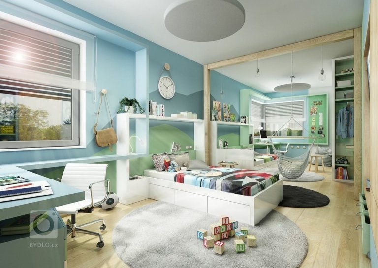 V projektu byly původně dva pokoje, ale na přání dětí zůstaly jako jeden. Společný dětský pokoj pro dva kluky. Každý má své království, ale přitom jsou spolu. Originálním prvkem jsou nábytkové rámy kolem oken, postelí, nástěnek, atd. Vzájemně se prolínají a vytváří tak pracovní, úložný i odkládací prostor.