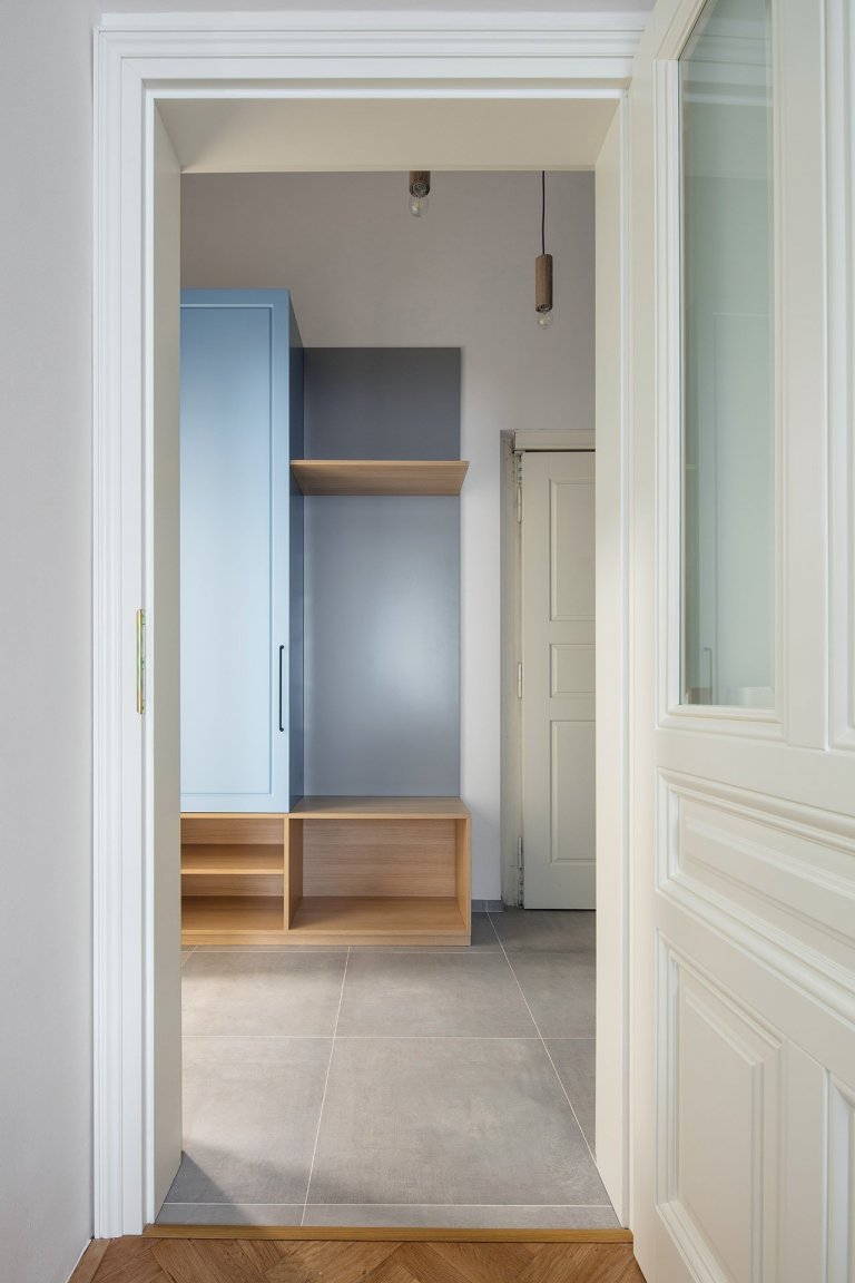 V bytě bylo nutné vyměnit podlahové krytiny za dubové parkety a provést opravy u stávajících. V kuchyni volně parkety navazují na cementovou dlažbu, ve vstupní chodbě a koupelně se položila dlažba větších formátů, která přechází až do sprchového koutu. Byt prošel menší dispoziční úpravou posunutím příček, zazděním původního vchodu do kuchyně a vytvořením nového průchodu z obývacího pokoje. Na to navazují nové pozice osvětlení a ovladačů, stejně jako nová příprava pro kuchyň.