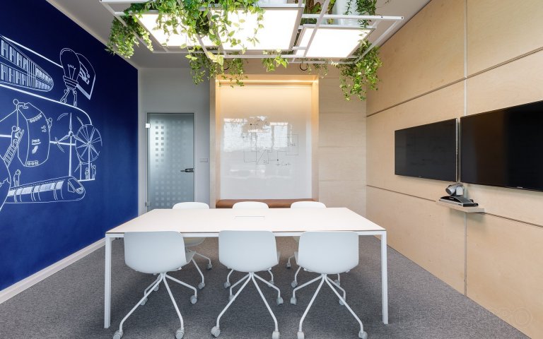 Malou zasedací místnost jsme proměnili na hřejivé místo plné dřeva a zeleně. Jednoduchý severský design je doplněn o modrou zeď z ruční kresbou ve firemní barevnosti.
