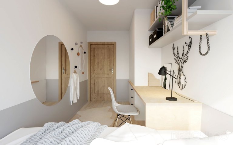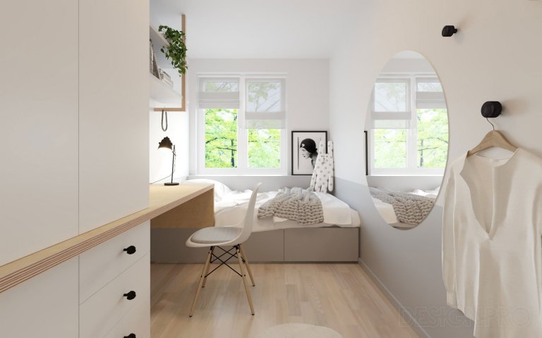 Každá dívka má svůj pokoj, obě ho chtěly v severském stylu a přitom každá svůj originál. Ačkoli jsou pokojíky opravdu malinké (větší 8 metry a menší dokonce jen 6 metry čtvereční) podařilo se nám navrhnout každý pokojích s vlastní atmosférou za použití stejných materiálů. Pokoj má vždy velký psací stůl, úložné police, velkou šatní skříň a pohodlnou postel. I na malém prostoru se dá zařídit kvalitní, plnohodnotný a útulný pokoj.