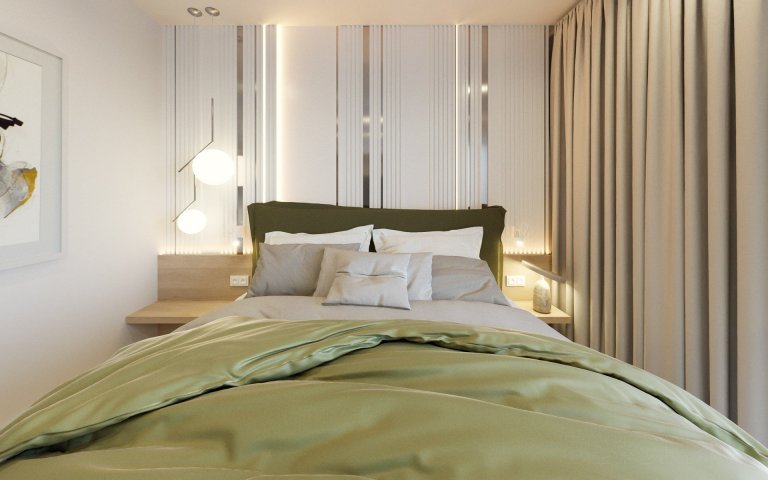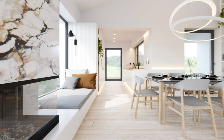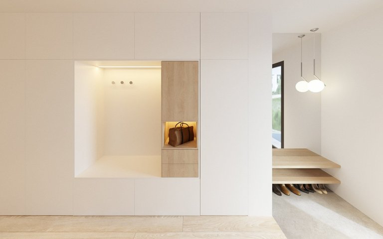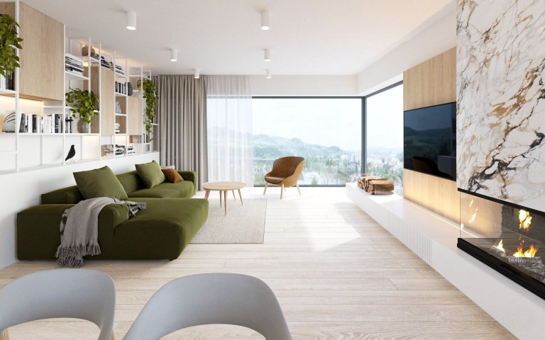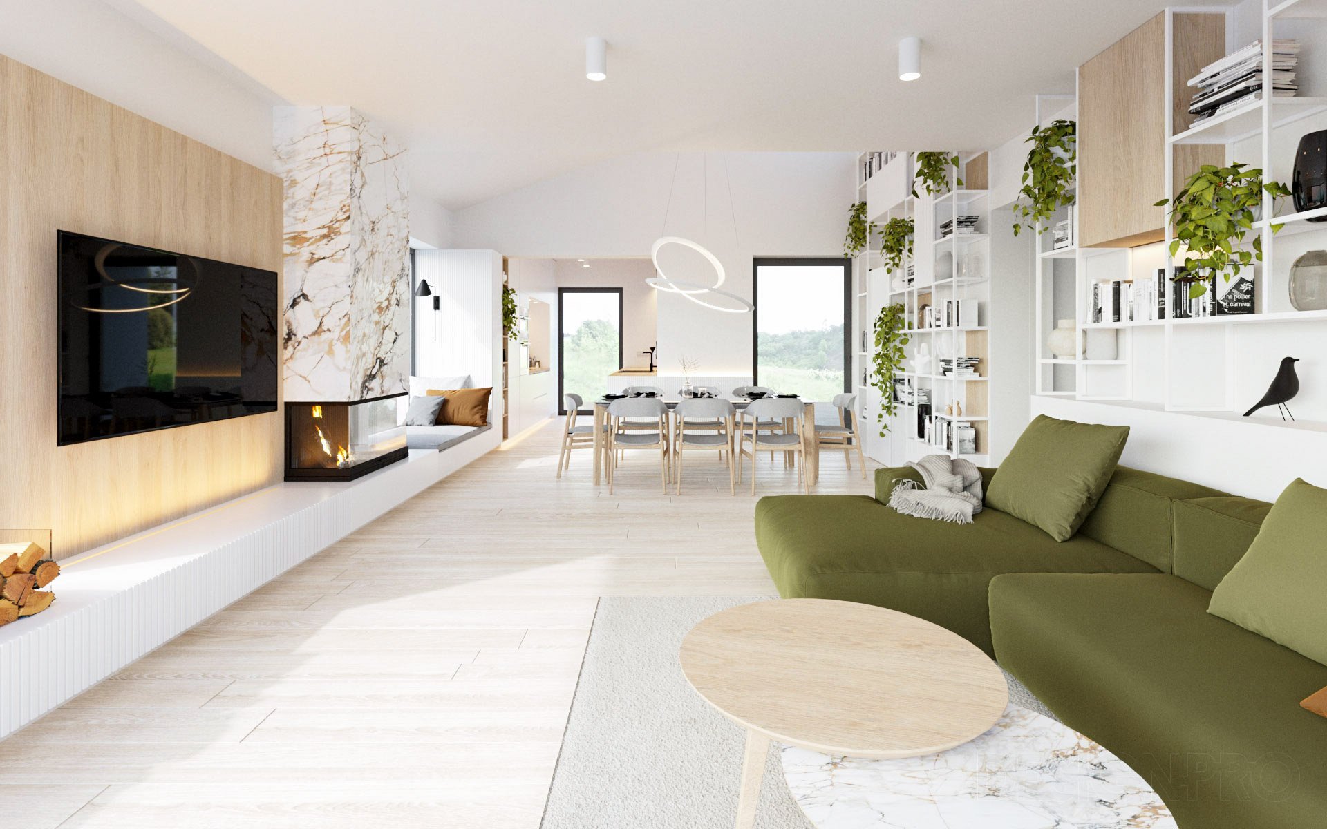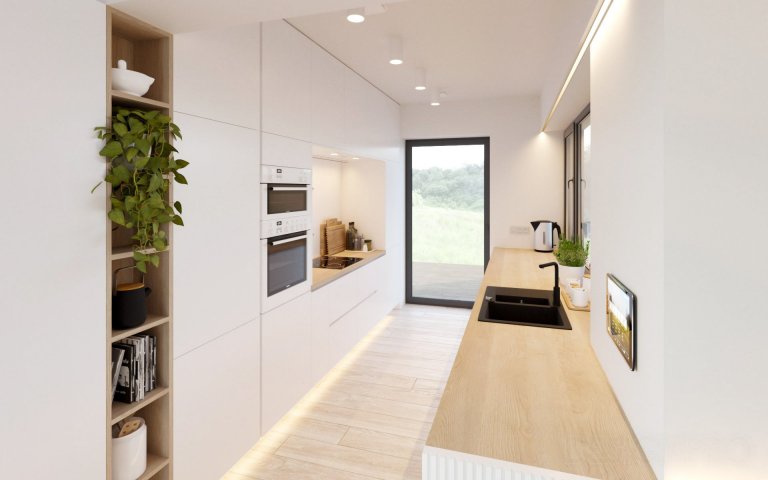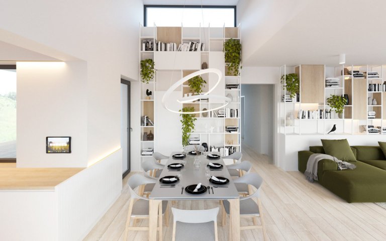 Klienti za námi přišli před zahájením výstavby domu, proto jsme mohli upravit některé neduhy v návrhu od stavaře. Za úkol jsme měli navrhnout celý interiér domu, který vyrostl na svahu nad městem s výhledem na Beroun. Světlým interiérem je vedena zelený akcent doplněný světlým odstínem dřeva, nadčasovou šedou a bílou. Spojujícím prvkem jsou i bílé kovové konstrukce knihovny a vertikální line ve vestavěném nábytku. Do detailu byl řešen každý kus nábytku, inteligentní osvětlení prostor, napojení na chytrou domácnost a další specifické požadavky klienta.