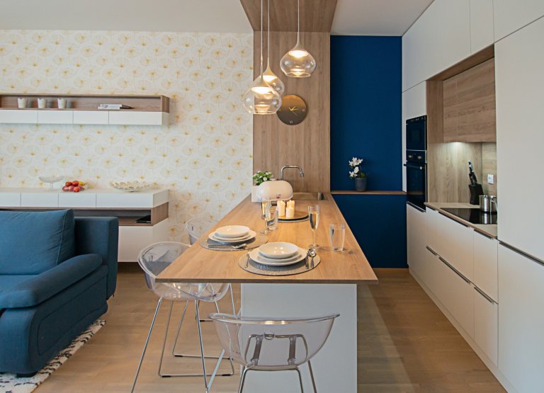 Voda se odráží v barvě mořské hlubiny, kterou jsme použily na výmalbu v kuchyňské části, na sedací soupravě, tapetě a koberci v předsíni. Tvar světel nad kuchyňským ostrůvkem kopíruje tvar kapek, sedáky barových židlí a stolek u sedací soupravy zase vodu napodobují průhledností.