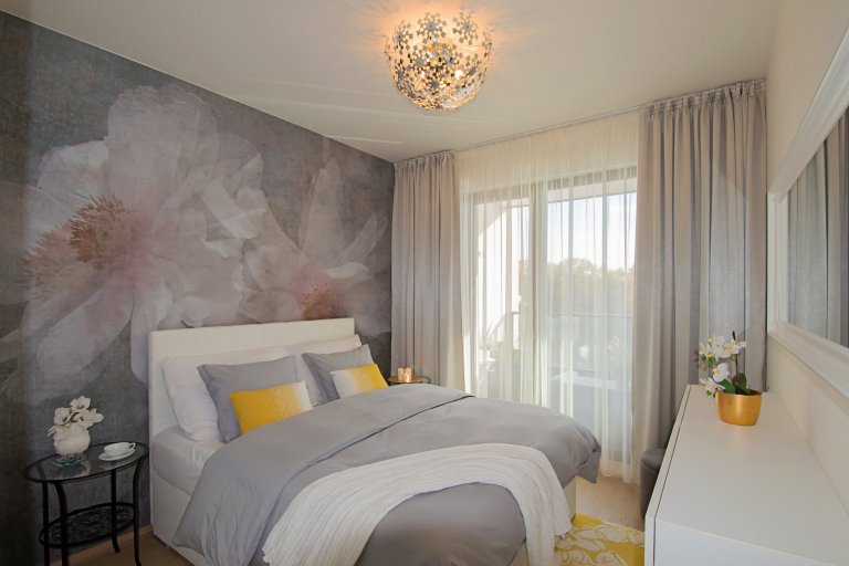 Jako protiklad k chladnější modré jsme zvolily hřejivé sluneční odstíny. Barvu slunce a sluneční paprsky připomíná závěsné světlo v obývací části, dekor na tapetě, subtilní křesílko a koberec v ložnici. Přírodní motivy jsou pak vidět na tapetách, koberci a stropním osvětlení v ložnici či na rámu zrcadla v předsíni a objevují se také v koupelně.