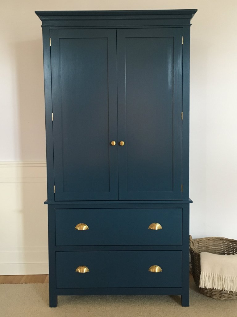 Klasická anglická ručně vyrobená kredenc z masivního tvrdého dřeva. Dubové šuplíky s rybinovým čepem. Ručně natřena tmavě modrou barvou. Vyrobeno v České republice,