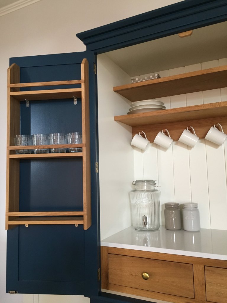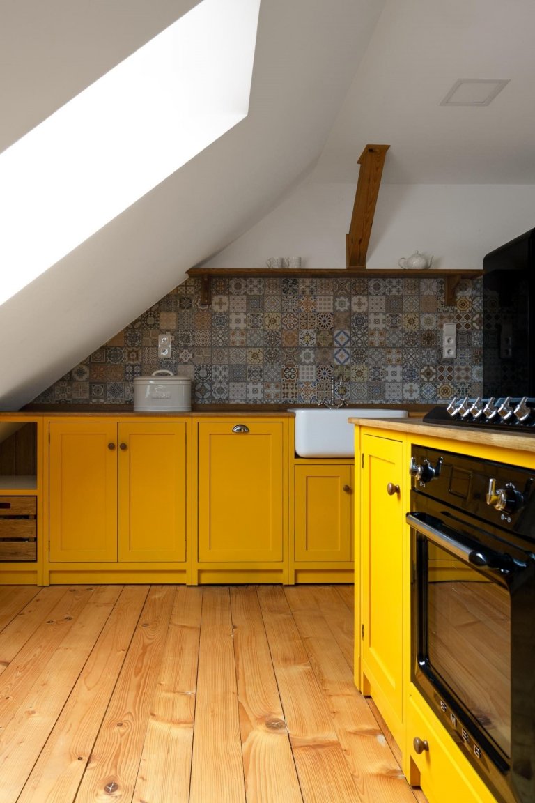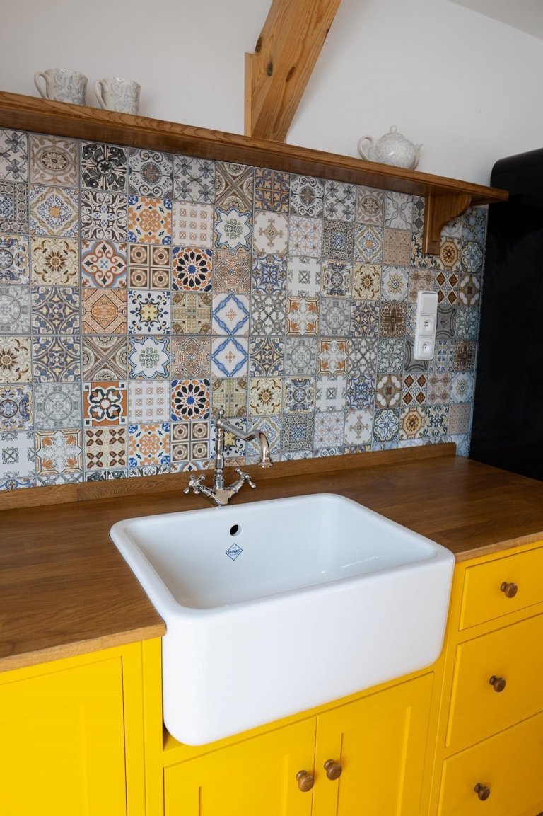 Dominantou kuchyně je krásný kuchyňský ostrůvek, v přední části s elegantními skleněnými dvířky. Na vnitřní straně kuchyňského ostrůvku je zabudovaná plynová varná deska a elektrická trouba značky SMEG. Černá barva spotřebičů vytváří úžasný kontrast s šafránově žlutou barvou. Všechny naše kuchyně precizně ručně natíráme. Úchytky dovezené z Velké Británie krásně ladí k pracovní desce a polici z masivního dubu. Dalším výrazným prvkem kuchyně je prostorný keramický belfast dřez anglické značky Shaws of Darwen, který je doplněn tradiční mosaznou baterií. Na přání klienta jsme vyrobili dubovou bedýnku na pojezdech pro uskladnění zeleniny.