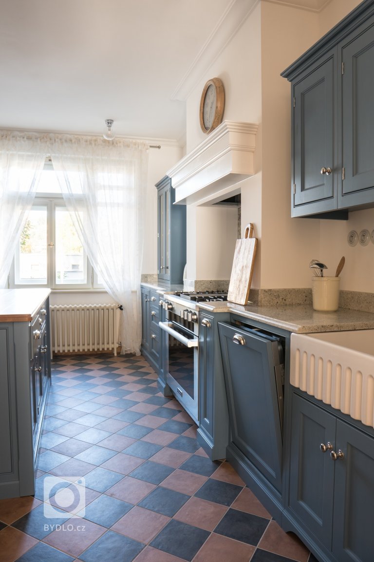 Tuto krásnou kuchyni jsme navrhli a vyrobili pro pražskou vilu z 30. let. Kuchyni v anglickém stylu vévodí klasický range cooker s falešným komínem. Dubové skříně tvoří společně s ručně natřeným ostrůvkem perfektní pár. Tento odstín modré barvy je krásný a nesmrtelný.