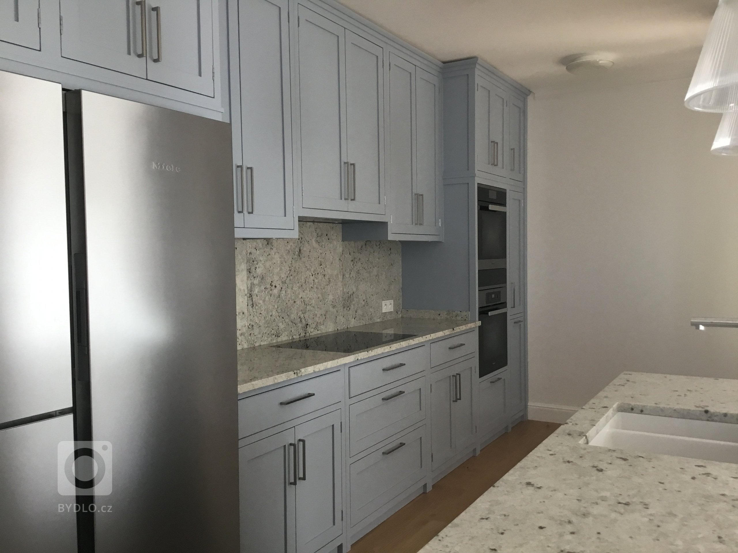 Kuchyně na míru v anglickém stylu vyrobená z masivního tvrdého dřeva, ručně natíraná. Kuchyně byla vyrobená v naší truhlárně nedaleko Prahy.