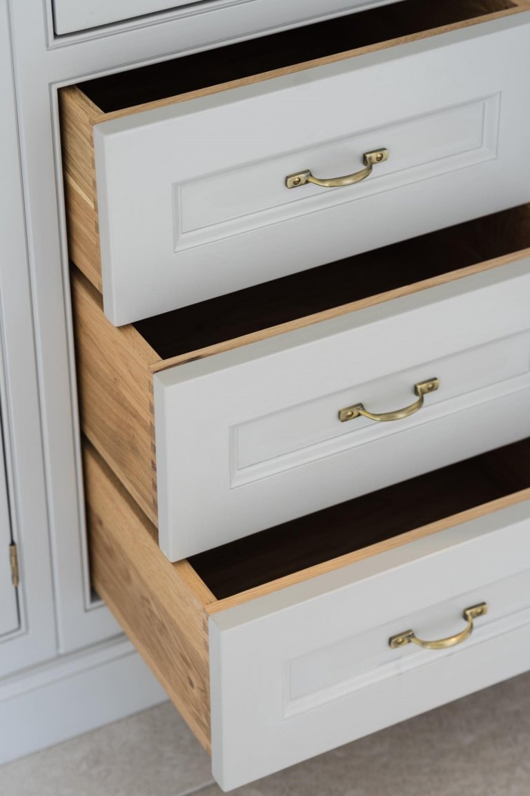 Tato krásná vstupní chodba, která hraje v každodenním rodinném shonu velkou roli, splňuje díky svému promyšlenému designu veškeré požadavky svých majitelů. Interiér prostoru je důležitým estetickým a funkčním prvkem celého domu. Ručně natíraný a tradičně vyráběný nábytek z masivního dřeva nabízí velkorysý úložný prostor. Luxusní šedá barva dodává prostoru na 'velikosti a nádherně podtrhuje krásu anglického stylu. Každá vstupní chodba si žádá lavici, na kterou se lze pohodlně posadit. Lavice s dubovou deskou má v sobě zabudované dvě zásuvky, které tvoří další úložný prostor pro drobné věci. Otevřené police mohou sloužit jako perfektní úložiště pro klobouky nebo kabelky. Dvě velké prostorné skříně nabízejí dostatek úložného prostoru.