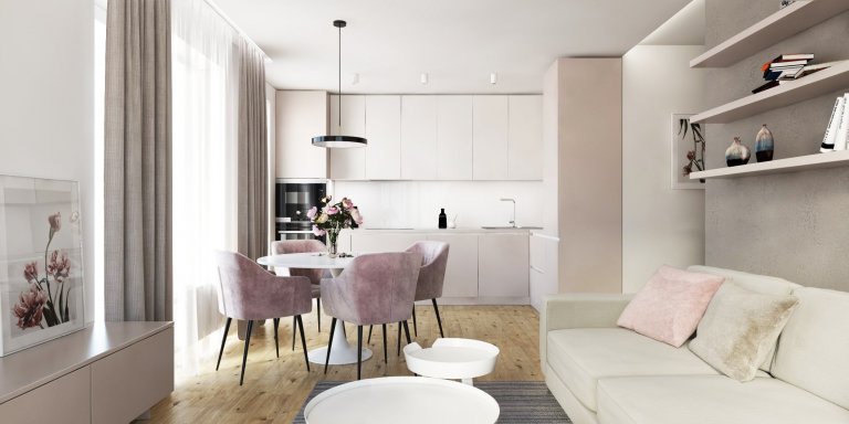 Jemný interiér dennej zóny v Slnečniciach v Bratislave.