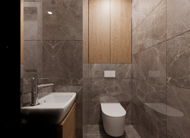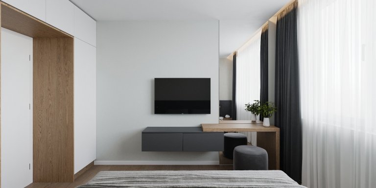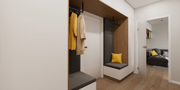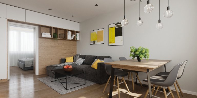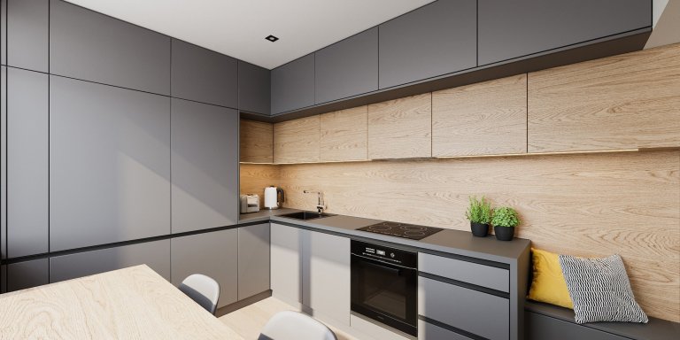 Nábytkové prvky vo výrazných materiáloch plynulo prechádzajú z priestoru kuchyne do obývačky, čím vytvárajú ucelený interiér dennej zóny bytu kde sme sa snažili z minima vyťažiť maximum ????