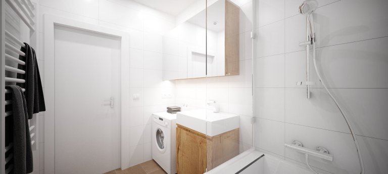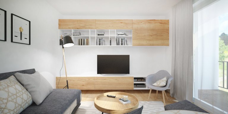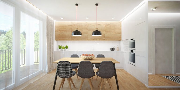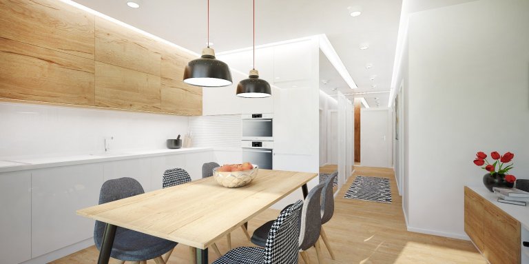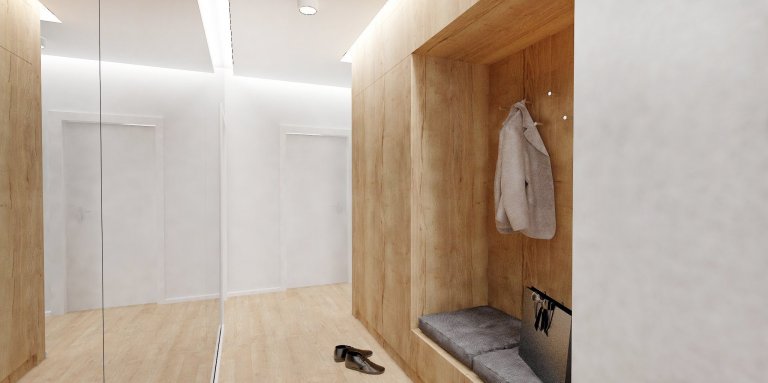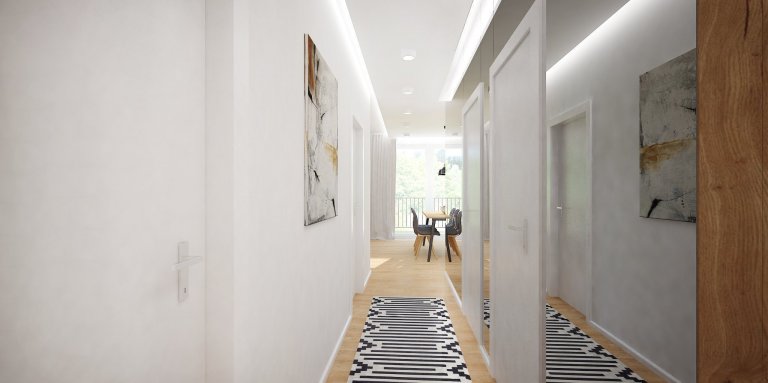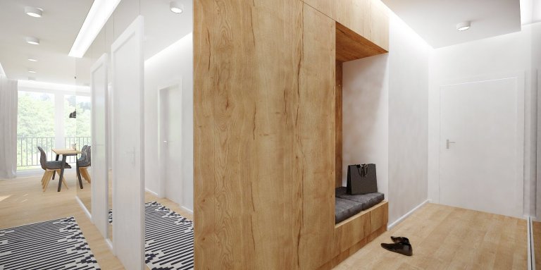 Ďalší interiér v obľúbenom projekte SLNEČNICE riešený ateliérom DOBRÝ INTERIÉR je krásne presvetlený a to najmä vďaka drevenému obkladu. Práve teplá farba dreva zútulňuje pomerne priestorný 4-izbový byt. Možným mínusom by mohla byť dlhá a úzka chodba. Tá však nabrala iný rozmer doplnením zrkadiel, ktoré ju opticky rozšírili a presvetlili.