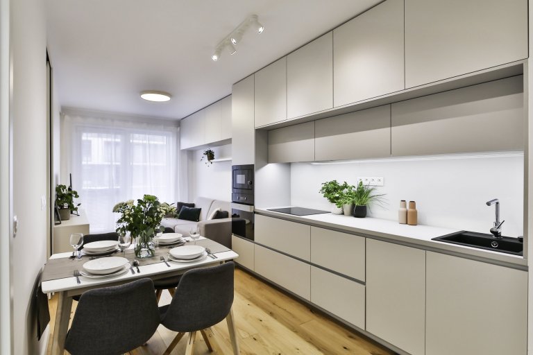 Moderný byt v Centre Bratislavy je charakteristický nadčasovým dizajnom a kontrastnými farbami ktoré dodávajú jedinečnosť v celom priestore.