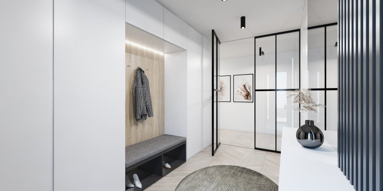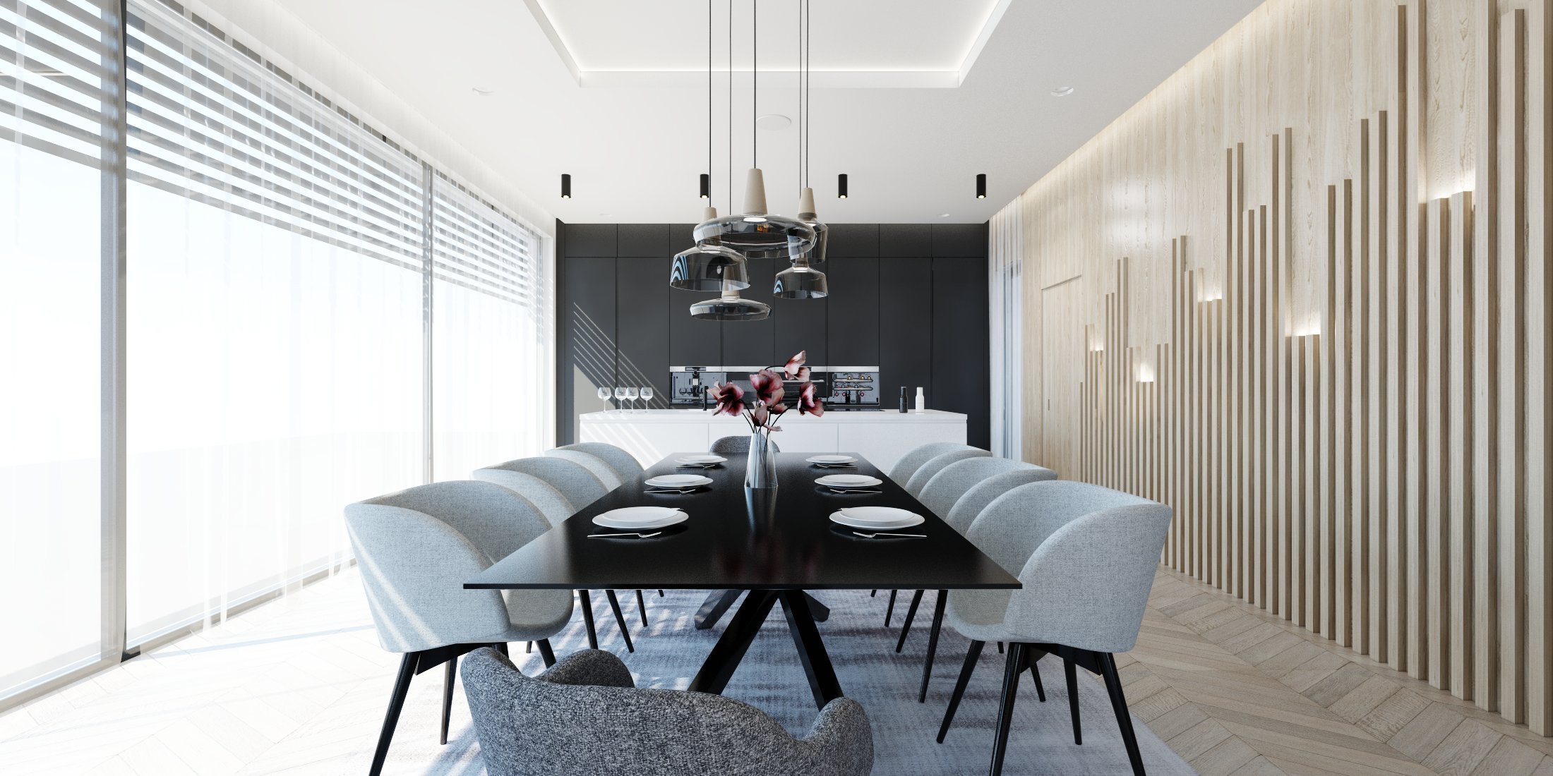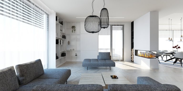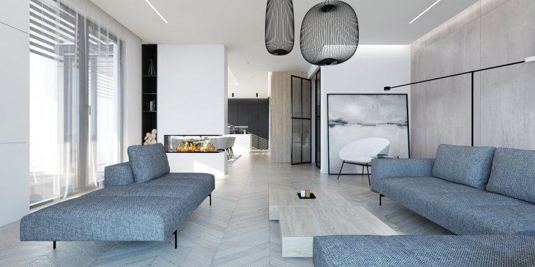 Minimalistický interiér rodinného domu, vyjadřuje touhu po volném prostoru s minimem nábytku. Čisté linie, jemné barvy, žádné vzory a jasné tvary. Základem je především čistota.