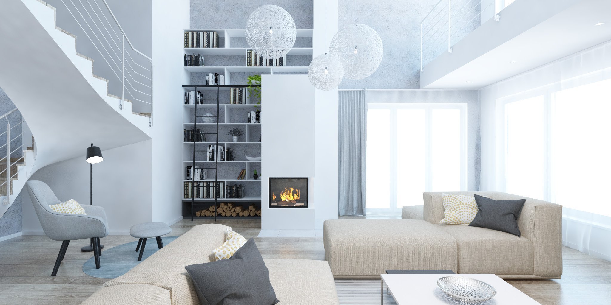 Achromatický interiér v bielych a sivých odtieňoch dômyselne zútulňuje veľkorysá modulová sedačka v hrejivej béžovej farbe, ktorá prepája jednotlivé funkcie interiéru a zároveň komunikuje s exteriérom.