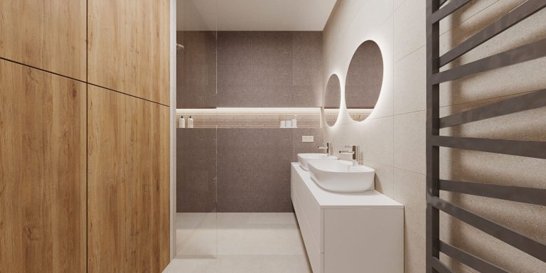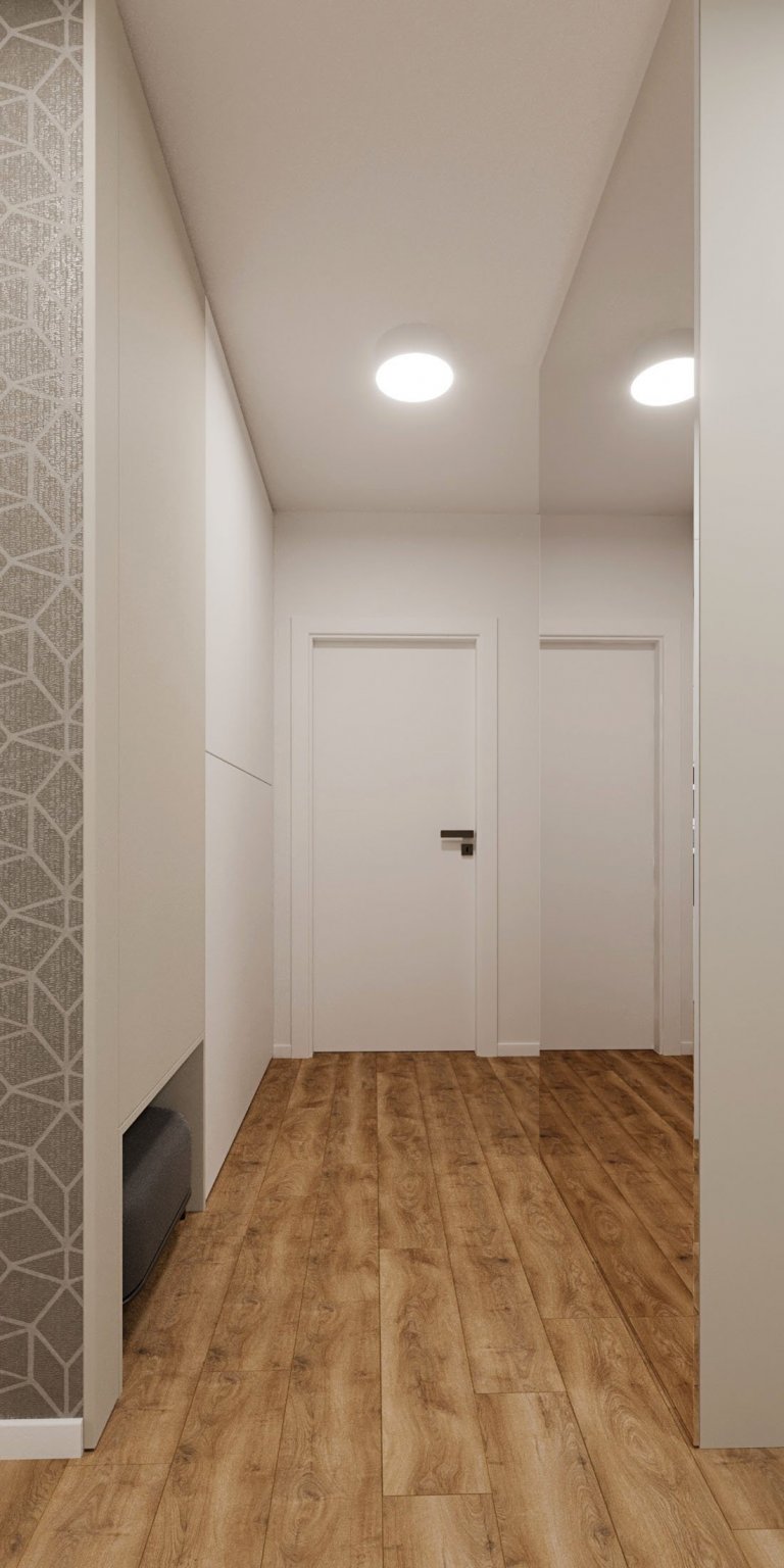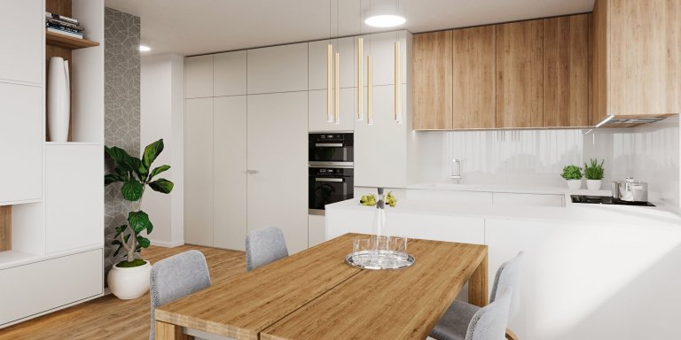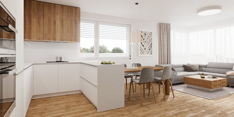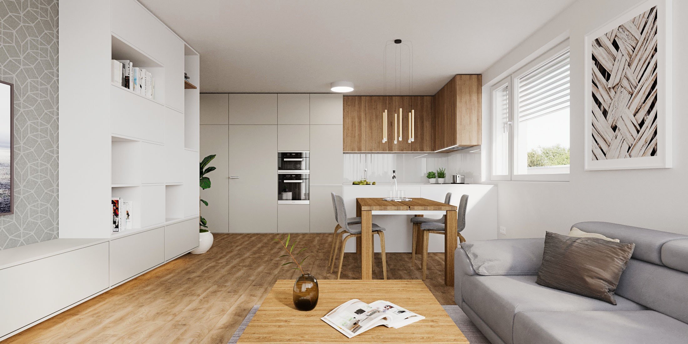 V dennej zóne dominuje drevo v kontraste s bielou pričom harmóniu farieb dopĺňa sivá tapeta a textília.