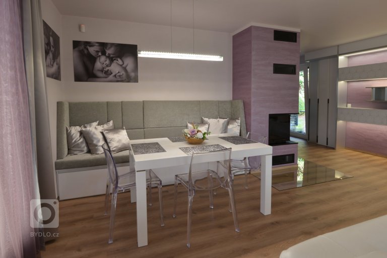 Pohled na čalouněný jídelní kout, vzniklý ve výklenku kde jsme zastavěli nepoužívané dveře do chodby.