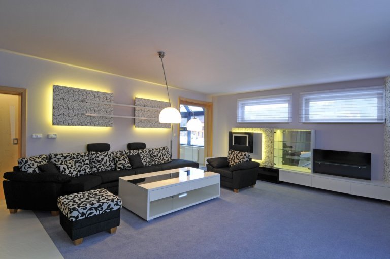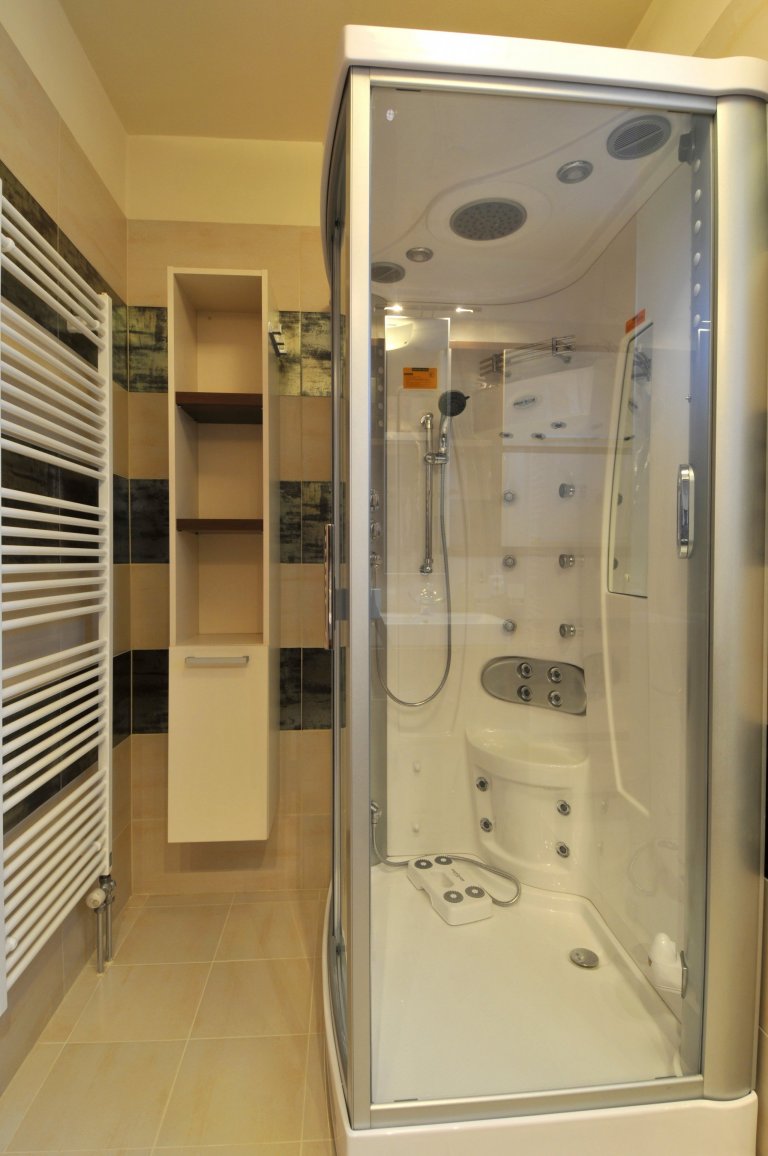 Byt ve kterém nezůstal kámen na kameni. Majitel koupil byt v polyfunkčním domě jako poslední volný, protože neměl dobrou dispozici a lidem se to nelíbilo. Jednalo se o osvíceného investora, který důvěřoval architektům, které si zvolil a nechal nás aby jsme navrhli vše co jsme pro byt pokládali za dobrí. Takže jsme vybourali skoro všechny příčky a udělali jsme zcela novou otevřenou dispozici., Jelikož se jednalo o byt pro muže , pojetí bylo co nejjednodušší v černých, stříbrných a bílích tónech. Pouze v ložnici jsme zvolili větší romantiku.