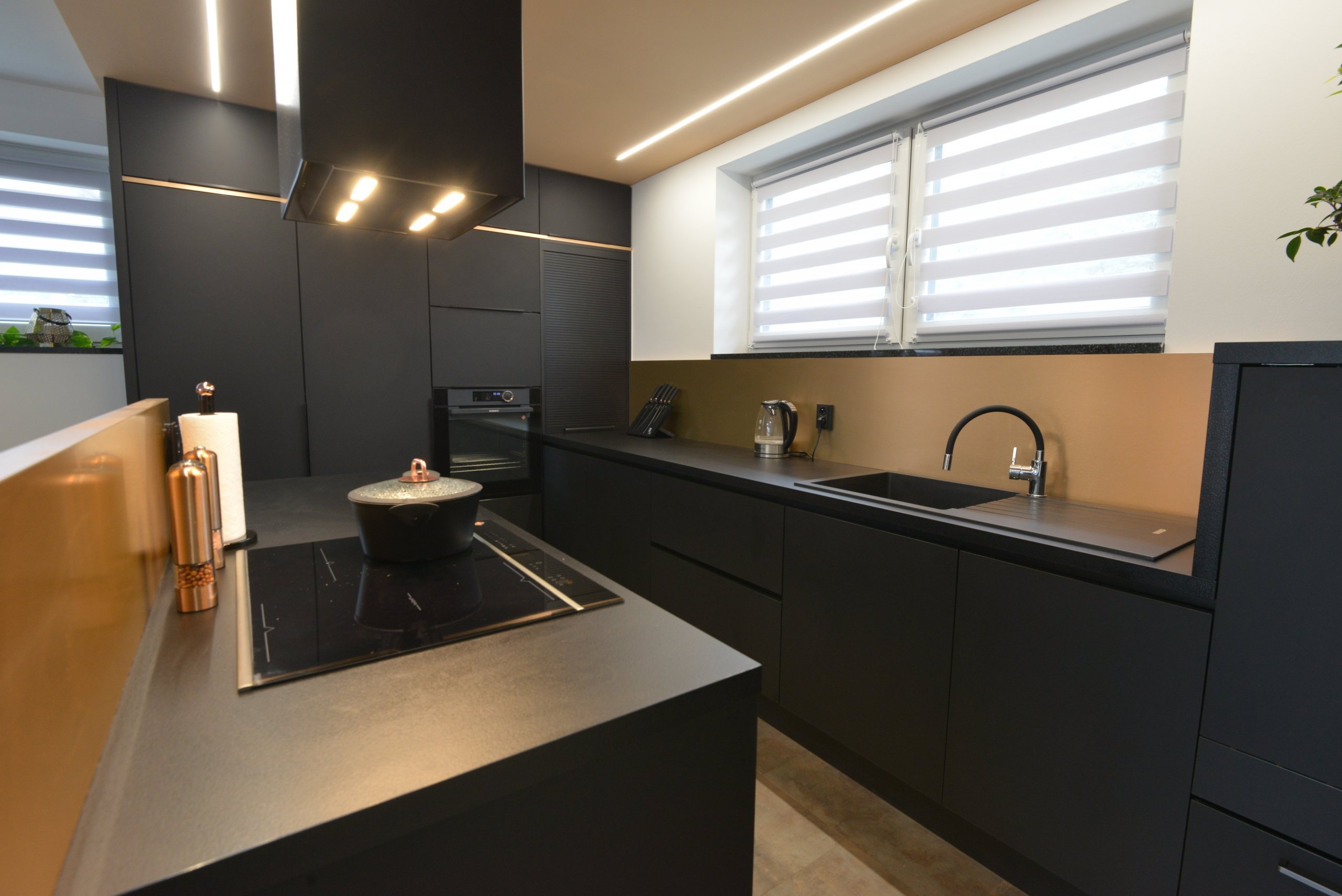 Klientka chtěla krásnou moderní kuchyni do nového domečku, ale nemohla se rozhodnout mezi betonem, bílou nebo černou. Do černé jsem jí přesvědčila já, na základě školení architektů, kde nás zástupce výrobce přesvědčil o kvalitě současných ultramatných materiálů a jejich bezotiskovém provedení. Pokud by někdo toužil po černé kuchyni, doporučuji investovat do kvalitních materiálů, aby se náročnost úklidu minimalizovala. Pochopitelně i tak je na černé vidět více, než by si běžná žena přála. Na doplnění a oživení černé jsem zvolila také jeden ze současných trendů a tou je měděná. Na kovolaminátu krásně vyniká a na dvířka je použita metalická folie v měděném provedení. Díky tomu, že měděná je trendy barva, je pro zákaznici snadné dokoupit si doplňky, máme k této kuchyni i hrnce v černé s měděnou. Barevně je pojat i snížený strop nad kuchyňskou částí, aby interiér působil veseleji. Kuchyně má pochopitelně maximální možnou výbavu v zásuvkách a osvětlení nejenom stropní, ale je podsvětlený celý ostrůvek, led páskou pod pracovní deskou. Na přání klientky jsme udělali zvýšenou myčku s přidanou zásuvkou na mycí prostředky. Co říkáte, ráda bych znala názory lidí ?