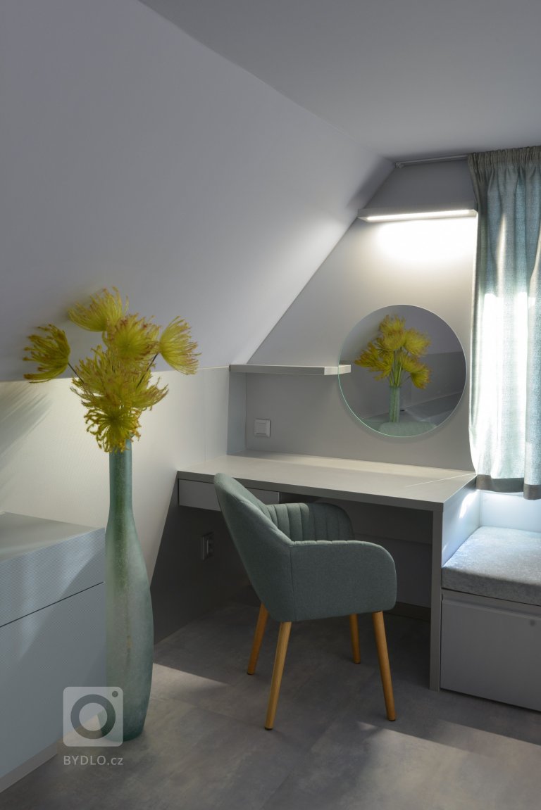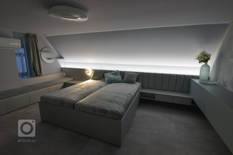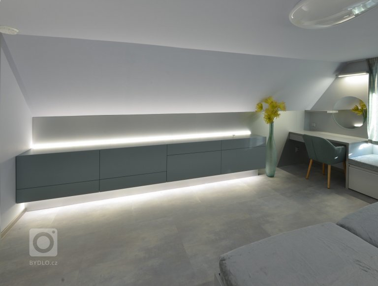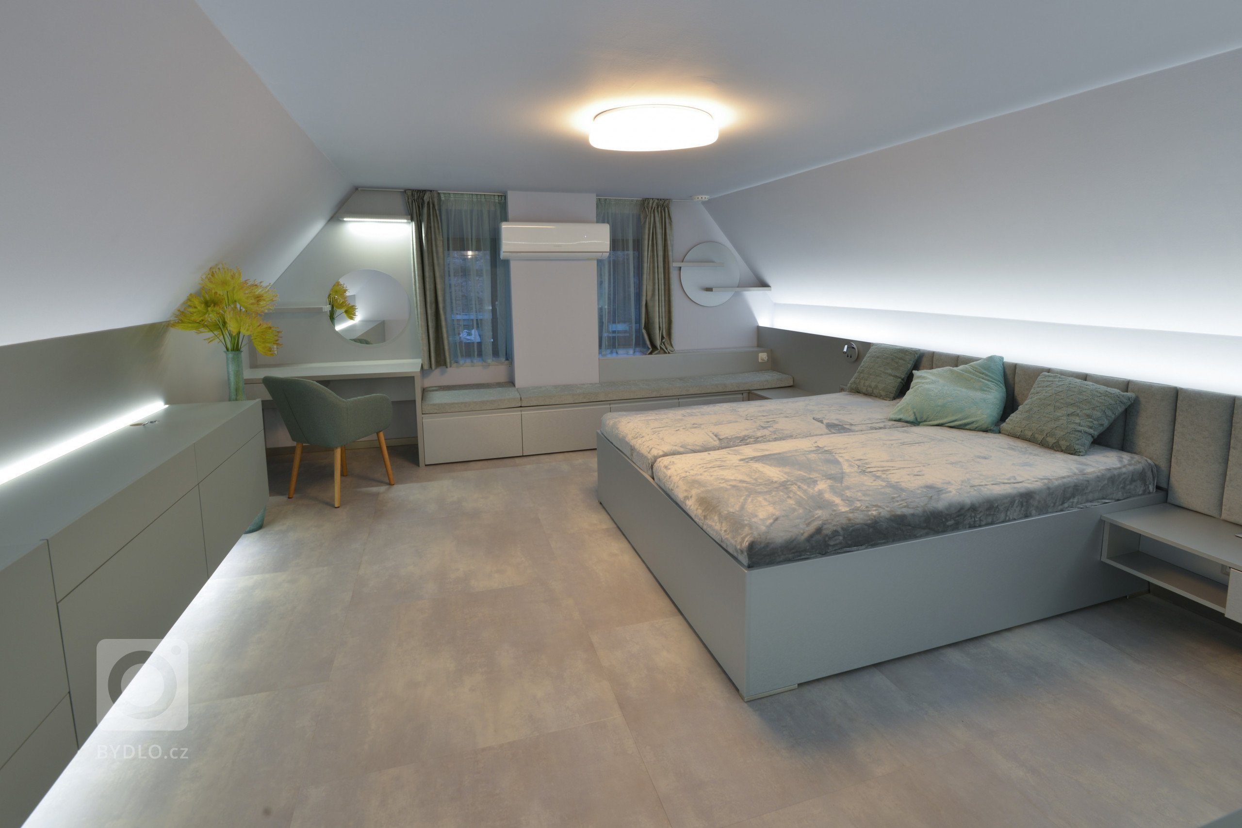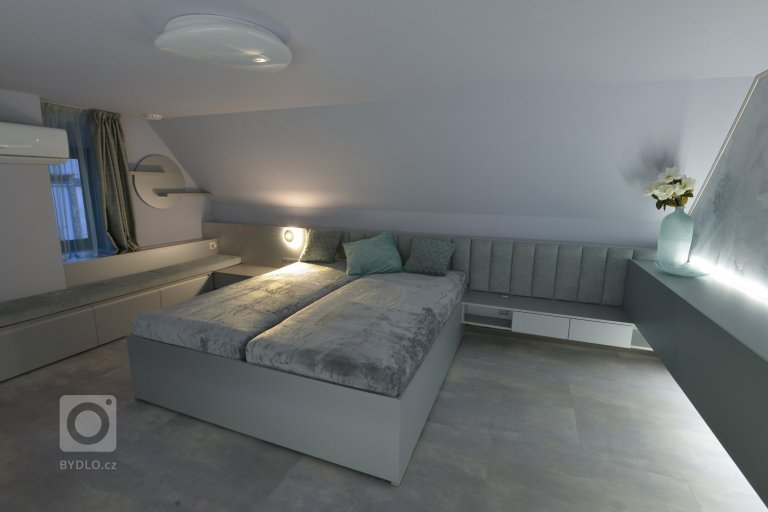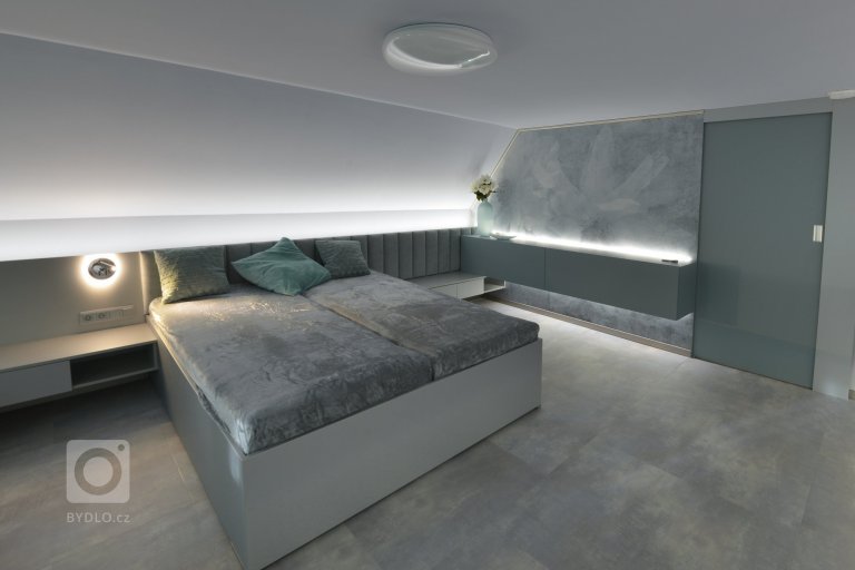 Ložnice v podkroví byla nezajímavá, nízká s nedostatkem denního světla Zvětšit okna nebylo možné, tak jsem jí doplnila více typy náladového osvětlení. Zákaznice si zvolila pro celý dům jako základní barvu šedou a stříbrnou, která prochází celým domem a v jednotlivých prostorech je vždy oživena doplňkovou barvou a to byla v ložnici mátová. Je to velice jemná uklidňující barva a ve výsledku vznikla moc hezká moderní ložnice se spoustou úložného prostoru.