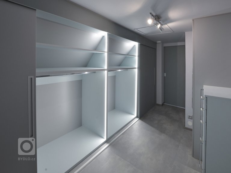 Pohled z druhé strany na otevřenou sestavu skříní s vnitřním osvětlením. V pozadí jsou zavřené posuvné dveře do ložnice.