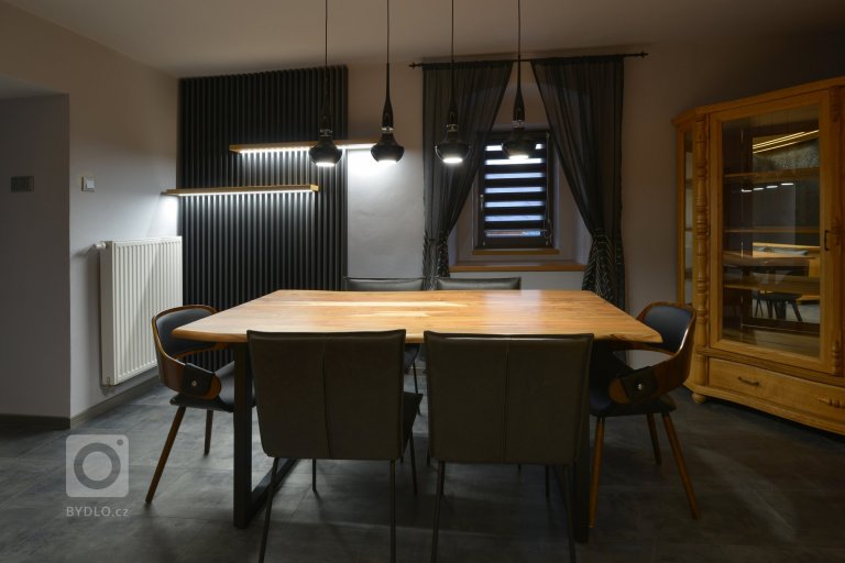 Na prázdné stěně již nebylo místo na žádný nábytek, protože místnost byla dost úzká. Protože ale bylo ptřeba prostor vyvážit, doplnili jsme stěnu o černý rošt s osvětlením.