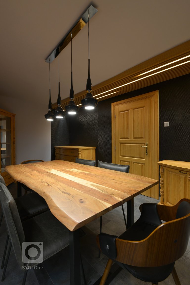 Nová jídelna byla doplněna hlavně vizuálně o tapetu v černé . Tapeta je ve struktuře výpletu. Nad ní část stropu rozdělena roštem v dubovém provedení se zapuštěným led osvětlením.